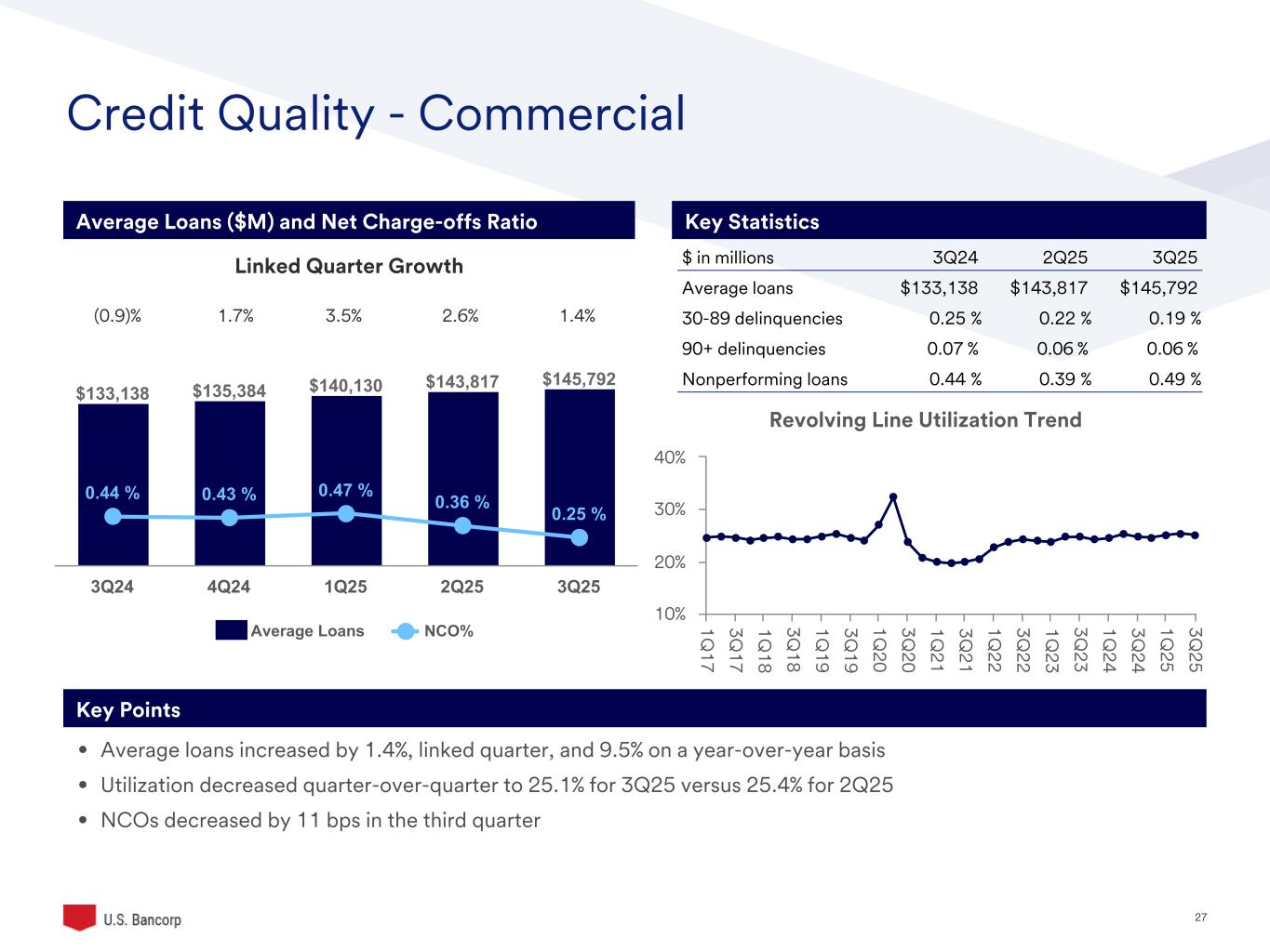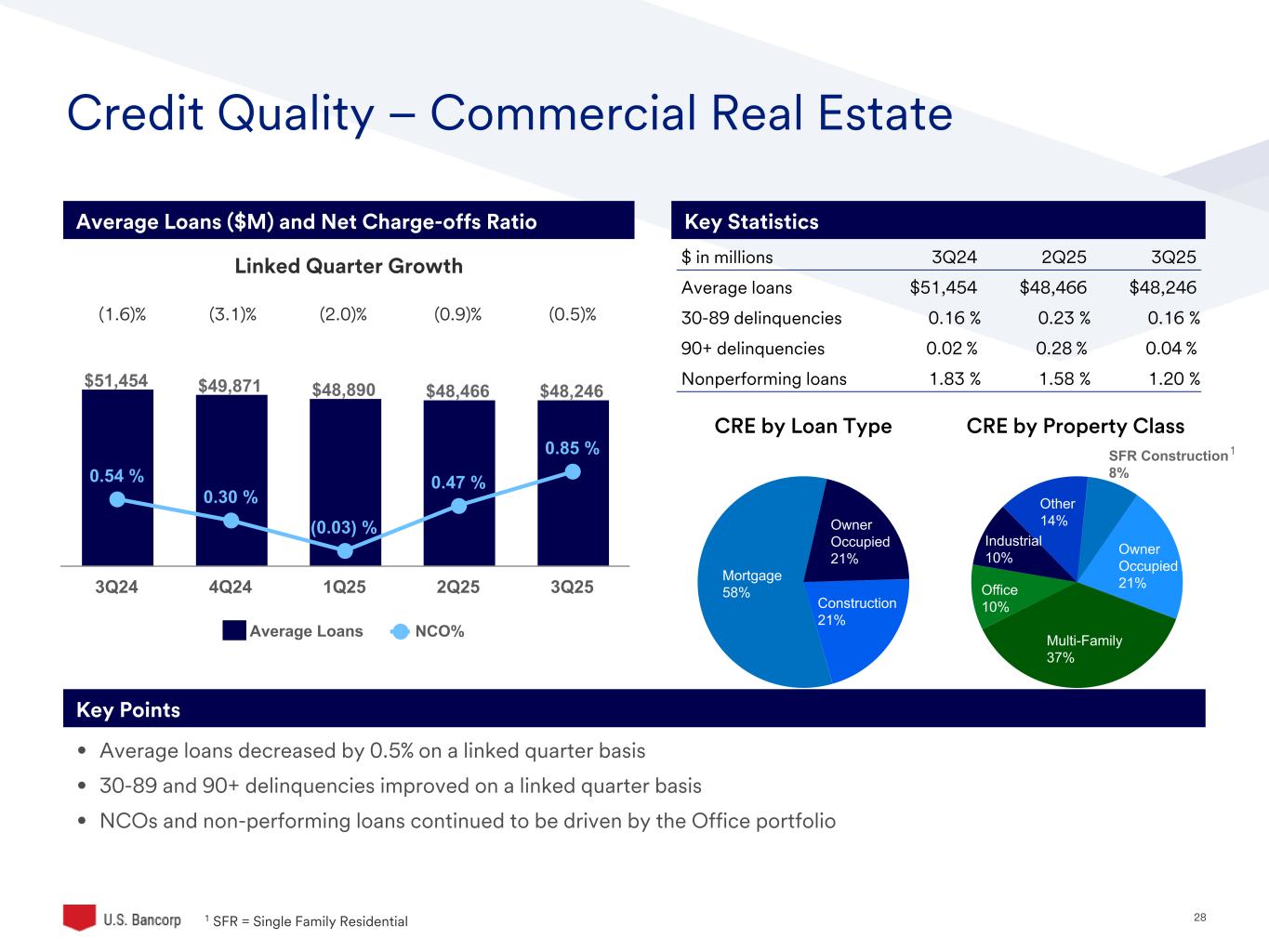 27©2025 U.S. Bank | Confidential Credit Quality - Commercial $133,138 $135,384 $140,130 $143,817 $145,792 0.44 % 0.43 % 0.47 % 0.36 % 0.25 % Average Loans NCO% 3Q24 4Q24 1Q25 2Q25 3Q25 Key StatisticsAverage Loans ($M) and Net Charge-offs Ratio (0.9)% 1.7% 3.5% 2.6% 1.4% Linked Quarter Growth Key Points • Average loans increased by 1.4%, linked quarter, and 9.5% on a year-over-year basis • Utilization decreased quarter-over-quarter to 25.1% for 3Q25 versus 25.4% for 2Q25 • NCOs decreased by 11 bps in the third quarter $ in millions 3Q24 2Q25 3Q25 Average loans $133,138 $143,817 $145,792 30-89 delinquencies 0.25 % 0.22 % 0.19 % 90+ delinquencies 0.07 % 0.06 % 0.06 % Nonperforming loans 0.44 % 0.39 % 0.49 % Revolving Line Utilization Trend 1Q 17 3Q 17 1Q 18 3Q 18 1Q 19 3Q 19 1Q 20 3Q 20 1Q 21 3Q 21 1Q 22 3Q 22 1Q 23 3Q 23 1Q 24 3Q 24 1Q 25 3Q 25 10% 20% 30% 40%