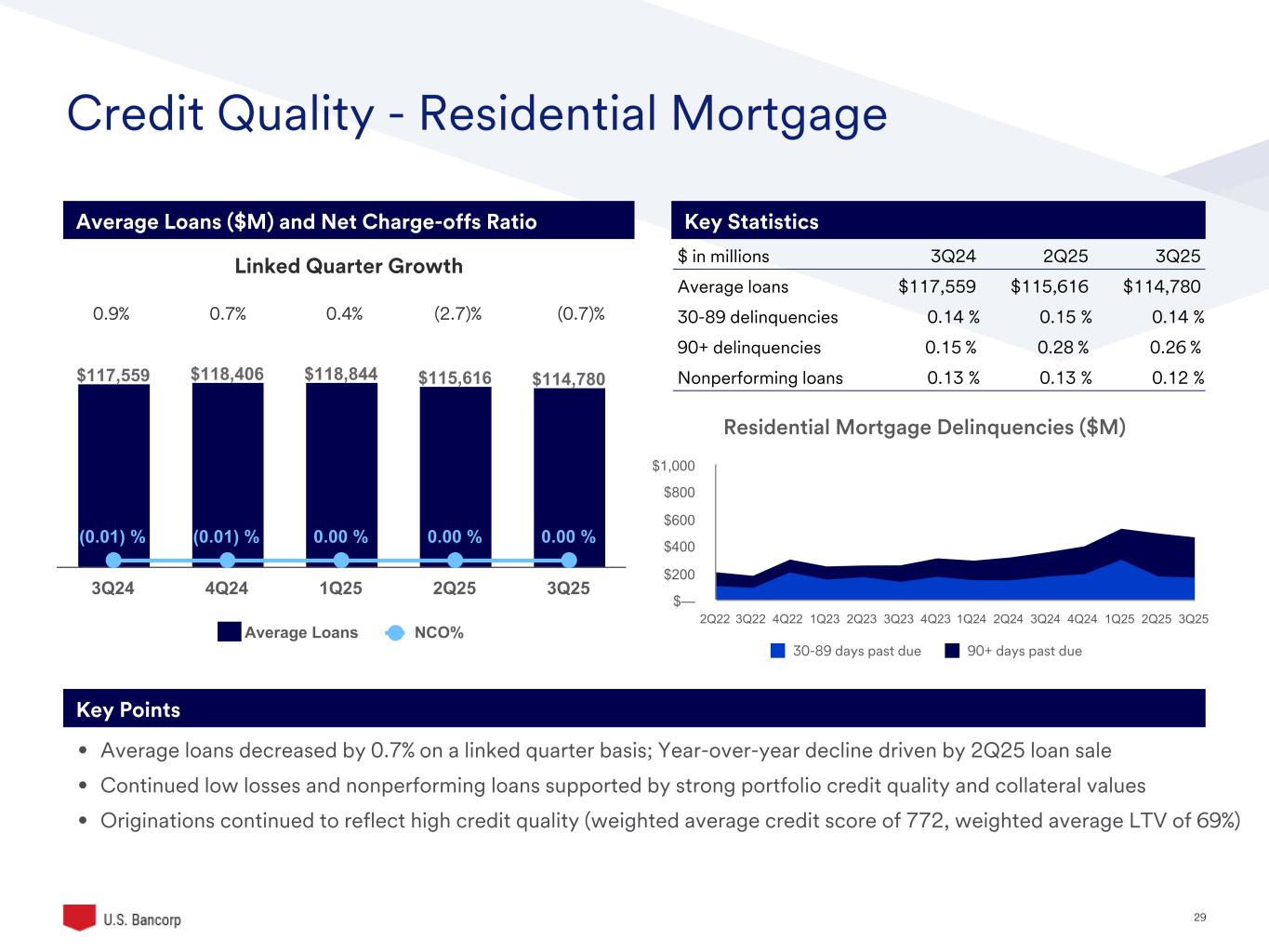 28©2025 U.S. Bank | Confidential CRE by Loan Type Mortgage 58% Owner Occupied 21% Construction 21% Credit Quality – Commercial Real Estate Key Points Average Loans ($M) and Net Charge-offs Ratio Key Statistics Linked Quarter Growth (1.6)% (3.1)% (2.0)% (0.9)% (0.5)% • Average loans decreased by 0.5% on a linked quarter basis • 30-89 and 90+ delinquencies improved on a linked quarter basis • NCOs and non-performing loans continued to be driven by the Office portfolio $51,454 $49,871 $48,890 $48,466 $48,246 0.54 % 0.30 % (0.03) % 0.47 % 0.85 % Average Loans NCO% 3Q24 4Q24 1Q25 2Q25 3Q25 CRE by Property Class SFR Construction 8% Owner Occupied 21% Multi-Family 37% Office 10% Industrial 10% Other 14% $ in millions 3Q24 2Q25 3Q25 Average loans $51,454 $48,466 $48,246 30-89 delinquencies 0.16 % 0.23 % 0.16 % 90+ delinquencies 0.02 % 0.28 % 0.04 % Nonperforming loans 1.83 % 1.58 % 1.20 % 1 1 SFR = Single Family Residential