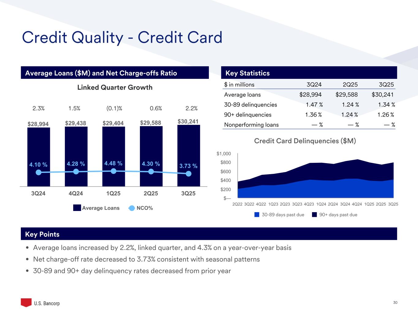 29©2025 U.S. Bank | Confidential Credit Quality - Residential Mortgage $117,559 $118,406 $118,844 $115,616 $114,780 (0.01) % (0.01) % 0.00 % 0.00 % 0.00 % Average Loans NCO% 3Q24 4Q24 1Q25 2Q25 3Q25 Key Points • Average loans decreased by 0.7% on a linked quarter basis; Year-over-year decline driven by 2Q25 loan sale • Continued low losses and nonperforming loans supported by strong portfolio credit quality and collateral values • Originations continued to reflect high credit quality (weighted average credit score of 772, weighted average LTV of 69%) Linked Quarter Growth Average Loans ($M) and Net Charge-offs Ratio Key Statistics $ in millions 3Q24 2Q25 3Q25 Average loans $117,559 $115,616 $114,780 30-89 delinquencies 0.14 % 0.15 % 0.14 % 90+ delinquencies 0.15 % 0.28 % 0.26 % Nonperforming loans 0.13 % 0.13 % 0.12 % 0.9% 0.7% 0.4% (2.7)% (0.7)% Residential Mortgage Delinquencies ($M) 30-89 days past due 90+ days past due 2Q22 3Q22 4Q22 1Q23 2Q23 3Q23 4Q23 1Q24 2Q24 3Q24 4Q24 1Q25 2Q25 3Q25 $— $200 $400 $600 $800 $1,000