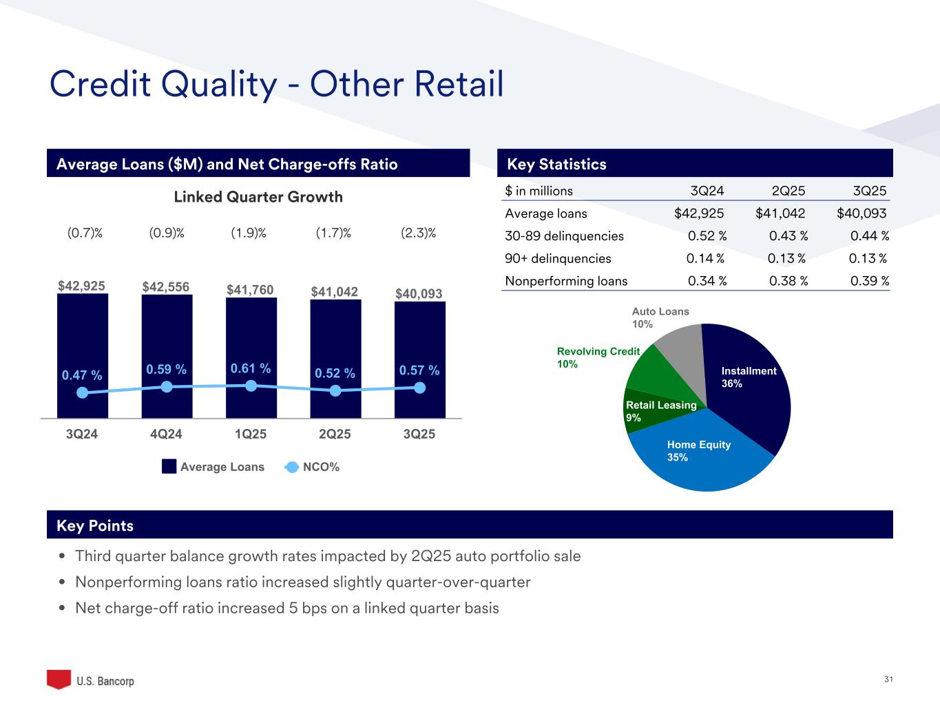 30©2025 U.S. Bank | Confidential Credit Quality - Credit Card $28,994 $29,438 $29,404 $29,588 $30,241 4.10 % 4.28 % 4.48 % 4.30 % 3.73 % Average Loans NCO% 3Q24 4Q24 1Q25 2Q25 3Q25 Key Points • Average loans increased by 2.2%, linked quarter, and 4.3% on a year-over-year basis • Net charge-off rate decreased to 3.73% consistent with seasonal patterns • 30-89 and 90+ day delinquency rates decreased from prior year Average Loans ($M) and Net Charge-offs Ratio Key Statistics 2.3% 1.5% (0.1)% 0.6% 2.2% Linked Quarter Growth $ in millions 3Q24 2Q25 3Q25 Average loans $28,994 $29,588 $30,241 30-89 delinquencies 1.47 % 1.24 % 1.34 % 90+ delinquencies 1.36 % 1.24 % 1.26 % Nonperforming loans — % — % — % Credit Card Delinquencies ($M) 30-89 days past due 90+ days past due 2Q22 3Q22 4Q22 1Q23 2Q23 3Q23 4Q23 1Q24 2Q24 3Q24 4Q24 1Q25 2Q25 3Q25 $— $200 $400 $600 $800 $1,000