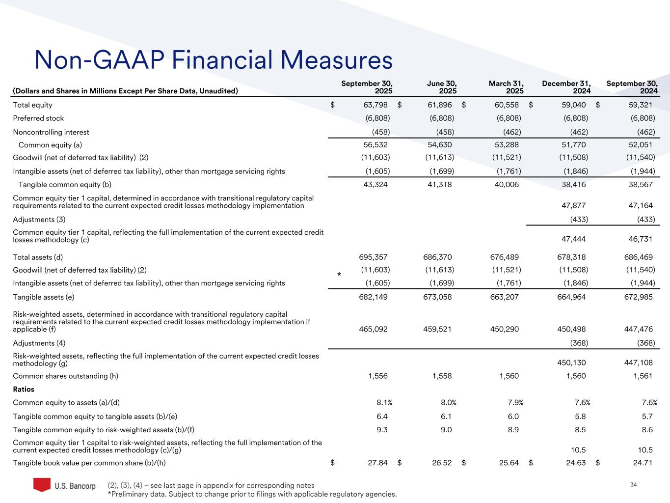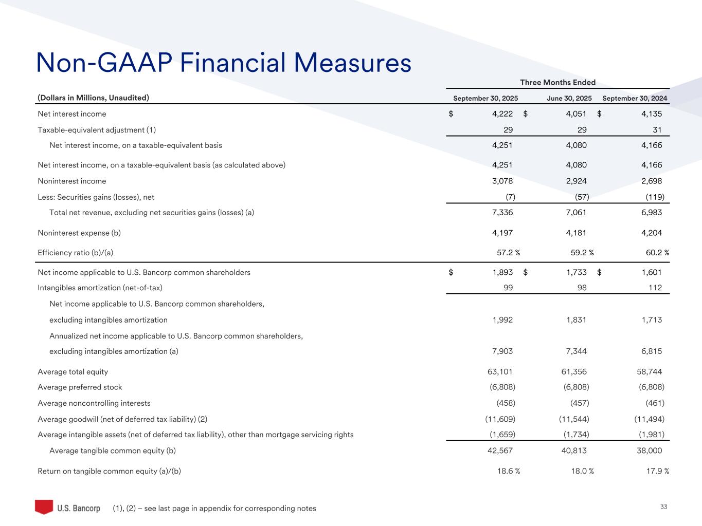 33©2025 U.S. Bank | Confidential Non-GAAP Financial Measures Three Months Ended (Dollars in Millions, Unaudited) September 30, 2025 June 30, 2025 September 30, 2024 Net interest income $ 4,222 $ 4,051 $ 4,135 Taxable-equivalent adjustment (1) 29 29 31 Net interest income, on a taxable-equivalent basis 4,251 4,080 4,166 Net interest income, on a taxable-equivalent basis (as calculated above) 4,251 4,080 4,166 Noninterest income 3,078 2,924 2,698 Less: Securities gains (losses), net (7) (57) (119) Total net revenue, excluding net securities gains (losses) (a) 7,336 7,061 6,983 Noninterest expense (b) 4,197 4,181 4,204 Efficiency ratio (b)/(a) 57.2 % 59.2 % 60.2 % Net income applicable to U.S. Bancorp common shareholders $ 1,893 $ 1,733 $ 1,601 Intangibles amortization (net-of-tax) 99 98 112 Net income applicable to U.S. Bancorp common shareholders, excluding intangibles amortization 1,992 1,831 1,713 Annualized net income applicable to U.S. Bancorp common shareholders, excluding intangibles amortization (a) 7,903 7,344 6,815 Average total equity 63,101 61,356 58,744 Average preferred stock (6,808) (6,808) (6,808) Average noncontrolling interests (458) (457) (461) Average goodwill (net of deferred tax liability) (2) (11,609) (11,544) (11,494) Average intangible assets (net of deferred tax liability), other than mortgage servicing rights (1,659) (1,734) (1,981) Average tangible common equity (b) 42,567 40,813 38,000 Return on tangible common equity (a)/(b) 18.6 % 18.0 % 17.9 % (1), (2) – see last page in appendix for corresponding notes