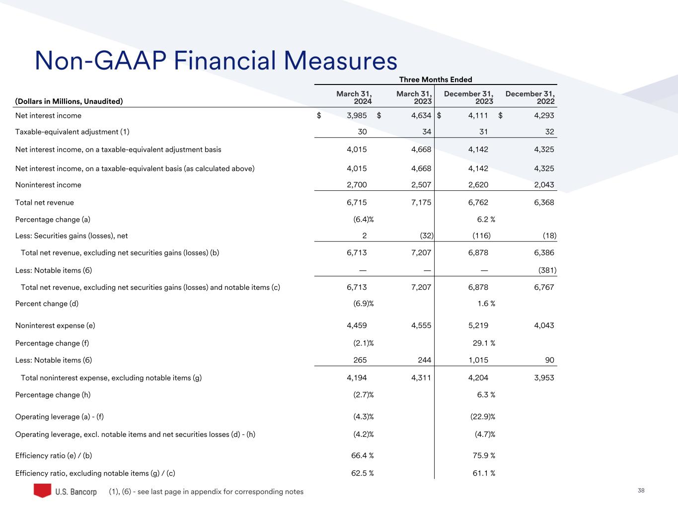 37©2025 U.S. Bank | Confidential Non-GAAP Financial Measures Three Months Ended (Dollars in Millions, Unaudited) December 31, 2024 December 31, 2023 September 30, 2024 September 30, 2023 June 30, 2024 June 30, 2023 Net interest income $ 4,146 $ 4,111 $ 4,135 $ 4,236 $ 4,023 $ 4,415 Taxable-equivalent adjustment (1) 30 31 31 32 29 34 Net interest income, on a taxable-equivalent adjustment basis 4,176 4,142 4,166 4,268 4,052 4,449 Net interest income, on a taxable-equivalent basis (as calculated above) 4,176 4,142 4,166 4,268 4,052 4,449 Noninterest income 2,833 2,620 2,698 2,764 2,815 2,726 Total net revenue 7,009 6,762 6,864 7,032 6,867 7,175 Percentage change (a) 3.7 % (2.4) % (4.3) % Less: Securities gains (losses), net (1) (116) (119) — (36) 3 Total net revenue, excluding net securities gains (losses) (b) 7,010 6,878 6,983 7,032 6,903 7,172 Less: Notable items (6) — — — — — (22) Total net revenue, excluding net securities gains (losses) and notable items (c) 7,010 6,878 6,983 7,032 6,903 7,194 Percent change (d) 1.9 % (0.7) % (4.0) % Noninterest expense (e) 4,311 5,219 4,204 4,530 4,214 4,569 Percentage change (f) (17.4) % (7.2) % (7.8) % Less: Notable items (6) 109 1,015 — 284 26 310 Total noninterest expense, excluding notable items (g) 4,202 4,204 4,204 4,246 4,188 4,259 Percentage change (h) — % (1.0) % (1.7) % Operating leverage (a) - (f) 21.1 % 4.8 % 3.5 % Operating leverage, excl. notable items and net securities losses (d) - (h) 1.9 % 0.3 % (2.3) % Efficiency ratio (e) / (b) 61.5 % 60.2 % 61.0 % Efficiency ratio, excluding notable items (g) / (c) 59.9 % 60.7 % (1), (6) - see last page in appendix for corresponding notes