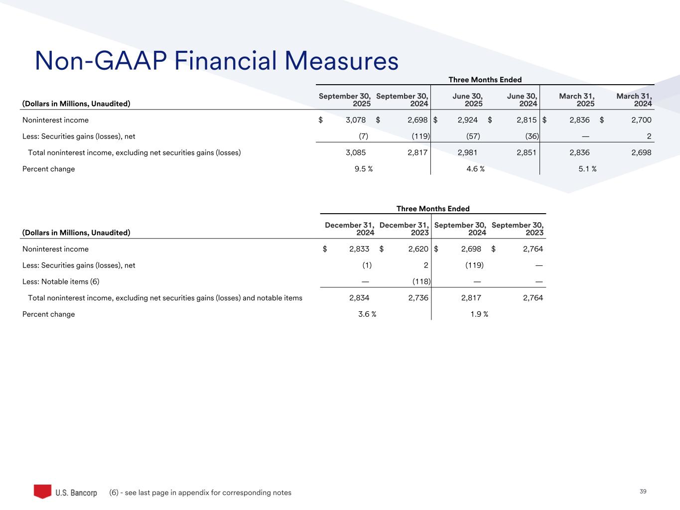 39©2025 U.S. Bank | Confidential Non-GAAP Financial Measures Three Months Ended (Dollars in Millions, Unaudited) September 30, 2025 September 30, 2024 June 30, 2025 June 30, 2024 March 31, 2025 March 31, 2024 Noninterest income $ 3,078 $ 2,698 $ 2,924 $ 2,815 $ 2,836 $ 2,700 Less: Securities gains (losses), net (7) (119) (57) (36) — 2 Total noninterest income, excluding net securities gains (losses) 3,085 2,817 2,981 2,851 2,836 2,698 Percent change 9.5 % 4.6 % 5.1 % (6) - se last page in appendix for corresponding notes Three Months Ended (Dollars in Millions, Unaudited) December 31, 2024 December 31, 2023 September 30, 2024 September 30, 2023 Noninterest income $ 2,833 $ 2,620 $ 2,698 $ 2,764 Less: Securities gains (losses), net (1) 2 (119) — Less: Notable items (6) — (118) — — Total noninterest income, excluding net securities gains (losses) and notable items 2,834 2,736 2,817 2,764 Percent change 3.6 % 1.9 %