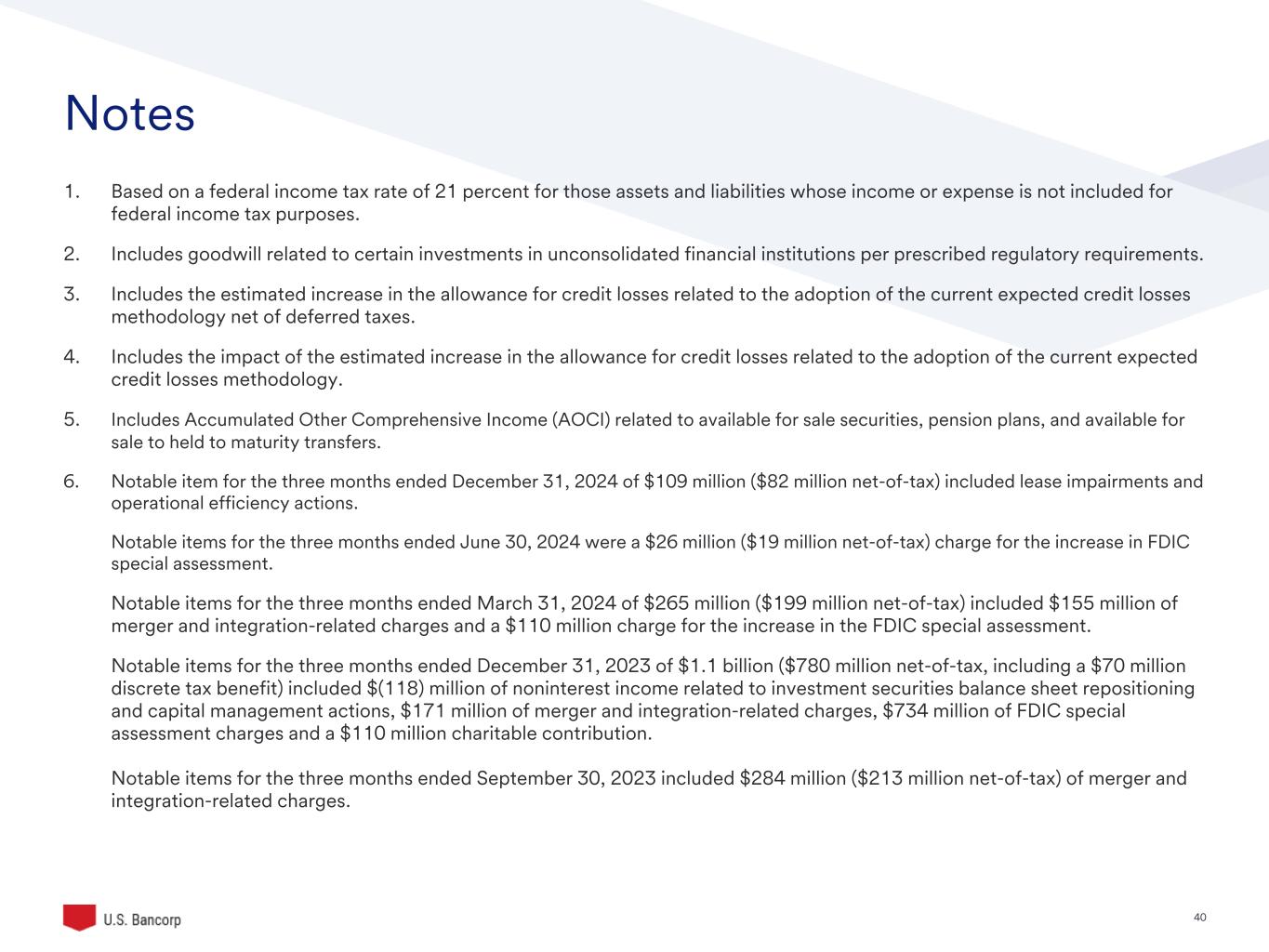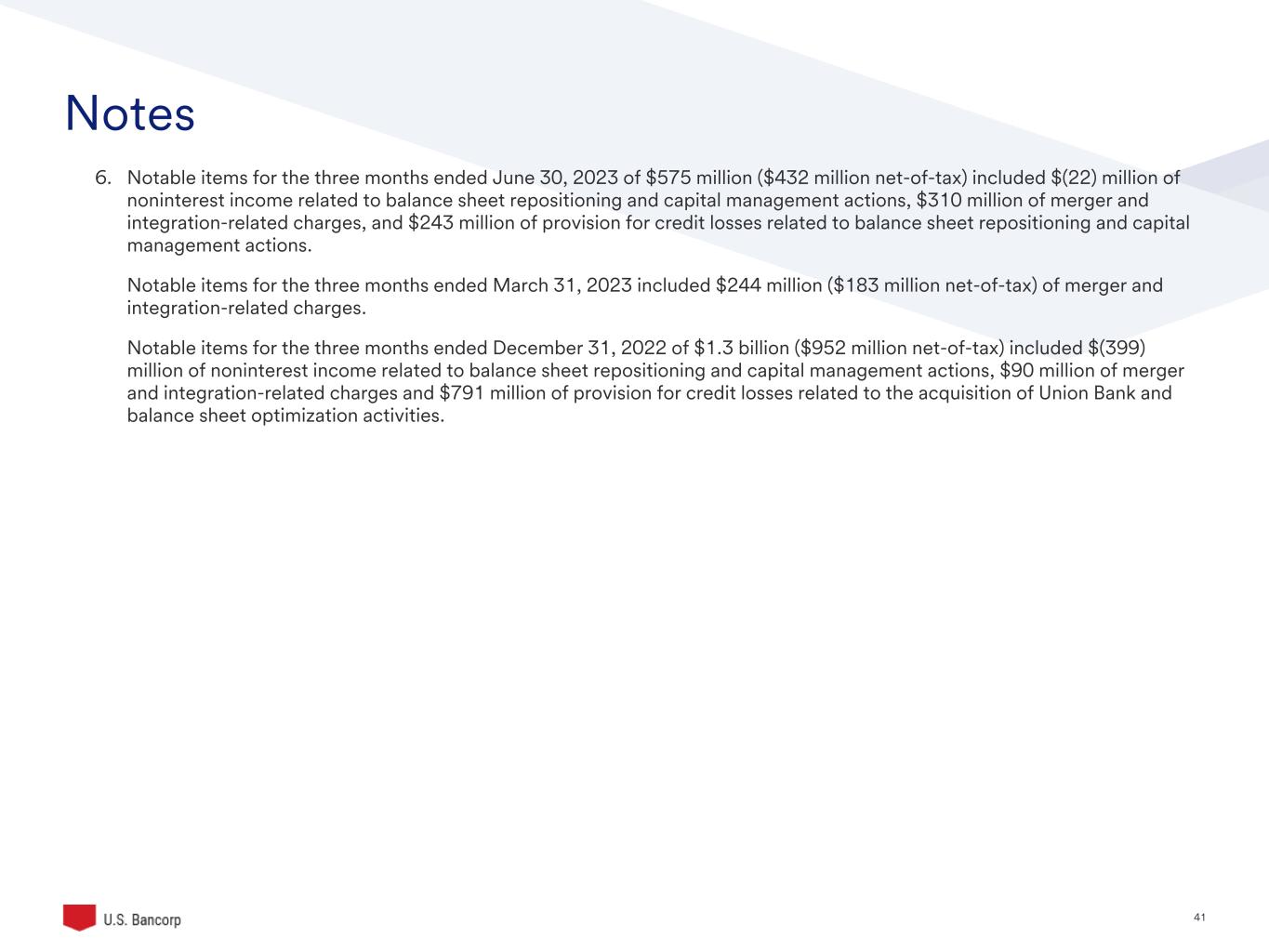 41©2025 U.S. Bank | Confidential 1. 2. 3. 4. 5. 6. Notable items for the three months ended June 30, 2023 of $575 million ($432 million net-of-tax) included $(22) million of noninterest income related to balance sheet repositioning and capital management actions, $310 million of merger and integration-related charges, and $243 million of provision for credit losses related to balance sheet repositioning and capital management actions. Notable items for the three months ended March 31, 2023 included $244 million ($183 million net-of-tax) of merger and integration-related charges. Notable items for the three months ended December 31, 2022 of $1.3 billion ($952 million net-of-tax) included $(399) million of noninterest income related to balance sheet repositioning and capital management actions, $90 million of merger and integration-related charges and $791 million of provision for credit losses related to the acquisition of Union Bank and balance sheet optimization activities. Notes