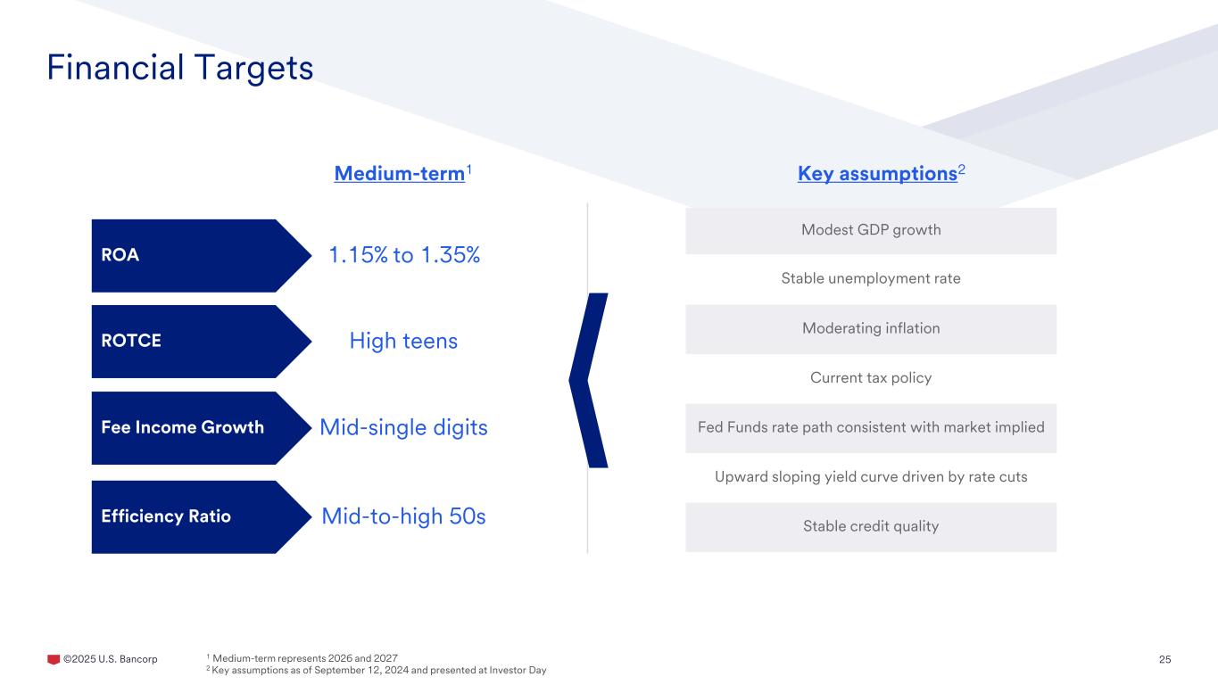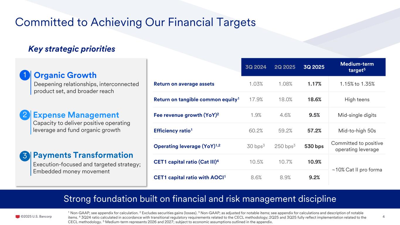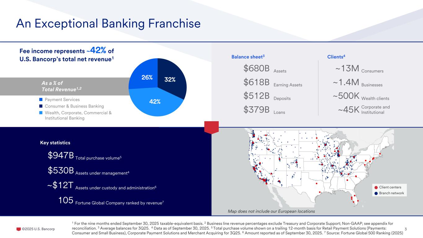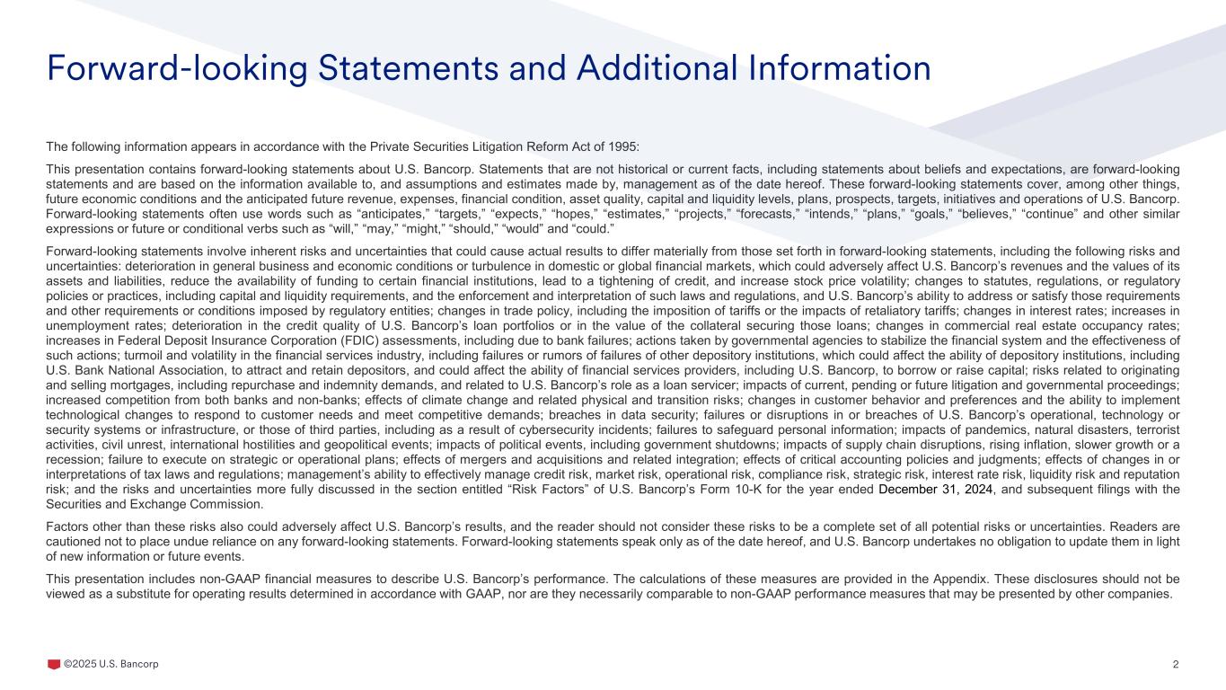©2025 U.S. Bancorp 2 Forward-looking Statements and Additional Information The following information appears in accordance with the Private Securities Litigation Reform Act of 1995: This presentation contains forward-looking statements about U.S. Bancorp. Statements that are not historical or current facts, including statements about beliefs and expectations, are forward-looking statements and are based on the information available to, and assumptions and estimates made by, management as of the date hereof. These forward-looking statements cover, among other things, future economic conditions and the anticipated future revenue, expenses, financial condition, asset quality, capital and liquidity levels, plans, prospects, targets, initiatives and operations of U.S. Bancorp. Forward-looking statements often use words such as “anticipates,” “targets,” “expects,” “hopes,” “estimates,” “projects,” “forecasts,” “intends,” “plans,” “goals,” “believes,” “continue” and other similar expressions or future or conditional verbs such as “will,” “may,” “might,” “should,” “would” and “could.” Forward-looking statements involve inherent risks and uncertainties that could cause actual results to differ materially from those set forth in forward-looking statements, including the following risks and uncertainties: deterioration in general business and economic conditions or turbulence in domestic or global financial markets, which could adversely affect U.S. Bancorp’s revenues and the values of its assets and liabilities, reduce the availability of funding to certain financial institutions, lead to a tightening of credit, and increase stock price volatility; changes to statutes, regulations, or regulatory policies or practices, including capital and liquidity requirements, and the enforcement and interpretation of such laws and regulations, and U.S. Bancorp’s ability to address or satisfy those requirements and other requirements or conditions imposed by regulatory entities; changes in trade policy, including the imposition of tariffs or the impacts of retaliatory tariffs; changes in interest rates; increases in unemployment rates; deterioration in the credit quality of U.S. Bancorp’s loan portfolios or in the value of the collateral securing those loans; changes in commercial real estate occupancy rates; increases in Federal Deposit Insurance Corporation (FDIC) assessments, including due to bank failures; actions taken by governmental agencies to stabilize the financial system and the effectiveness of such actions; turmoil and volatility in the financial services industry, including failures or rumors of failures of other depository institutions, which could affect the ability of depository institutions, including U.S. Bank National Association, to attract and retain depositors, and could affect the ability of financial services providers, including U.S. Bancorp, to borrow or raise capital; risks related to originating and selling mortgages, including repurchase and indemnity demands, and related to U.S. Bancorp’s role as a loan servicer; impacts of current, pending or future litigation and governmental proceedings; increased competition from both banks and non-banks; effects of climate change and related physical and transition risks; changes in customer behavior and preferences and the ability to implement technological changes to respond to customer needs and meet competitive demands; breaches in data security; failures or disruptions in or breaches of U.S. Bancorp’s operational, technology or security systems or infrastructure, or those of third parties, including as a result of cybersecurity incidents; failures to safeguard personal information; impacts of pandemics, natural disasters, terrorist activities, civil unrest, international hostilities and geopolitical events; impacts of political events, including government shutdowns; impacts of supply chain disruptions, rising inflation, slower growth or a recession; failure to execute on strategic or operational plans; effects of mergers and acquisitions and related integration; effects of critical accounting policies and judgments; effects of changes in or interpretations of tax laws and regulations; management’s ability to effectively manage credit risk, market risk, operational risk, compliance risk, strategic risk, interest rate risk, liquidity risk and reputation risk; and the risks and uncertainties more fully discussed in the section entitled “Risk Factors” of U.S. Bancorp’s Form 10-K for the year ended December 31, 2024, and subsequent filings with the Securities and Exchange Commission. Factors other than these risks also could adversely affect U.S. Bancorp’s results, and the reader should not consider these risks to be a complete set of all potential risks or uncertainties. Readers are cautioned not to place undue reliance on any forward-looking statements. Forward-looking statements speak only as of the date hereof, and U.S. Bancorp undertakes no obligation to update them in light of new information or future events. This presentation includes non-GAAP financial measures to describe U.S. Bancorp’s performance. The calculations of these measures are provided in the Appendix. These disclosures should not be viewed as a substitute for operating results determined in accordance with GAAP, nor are they necessarily comparable to non-GAAP performance measures that may be presented by other companies.