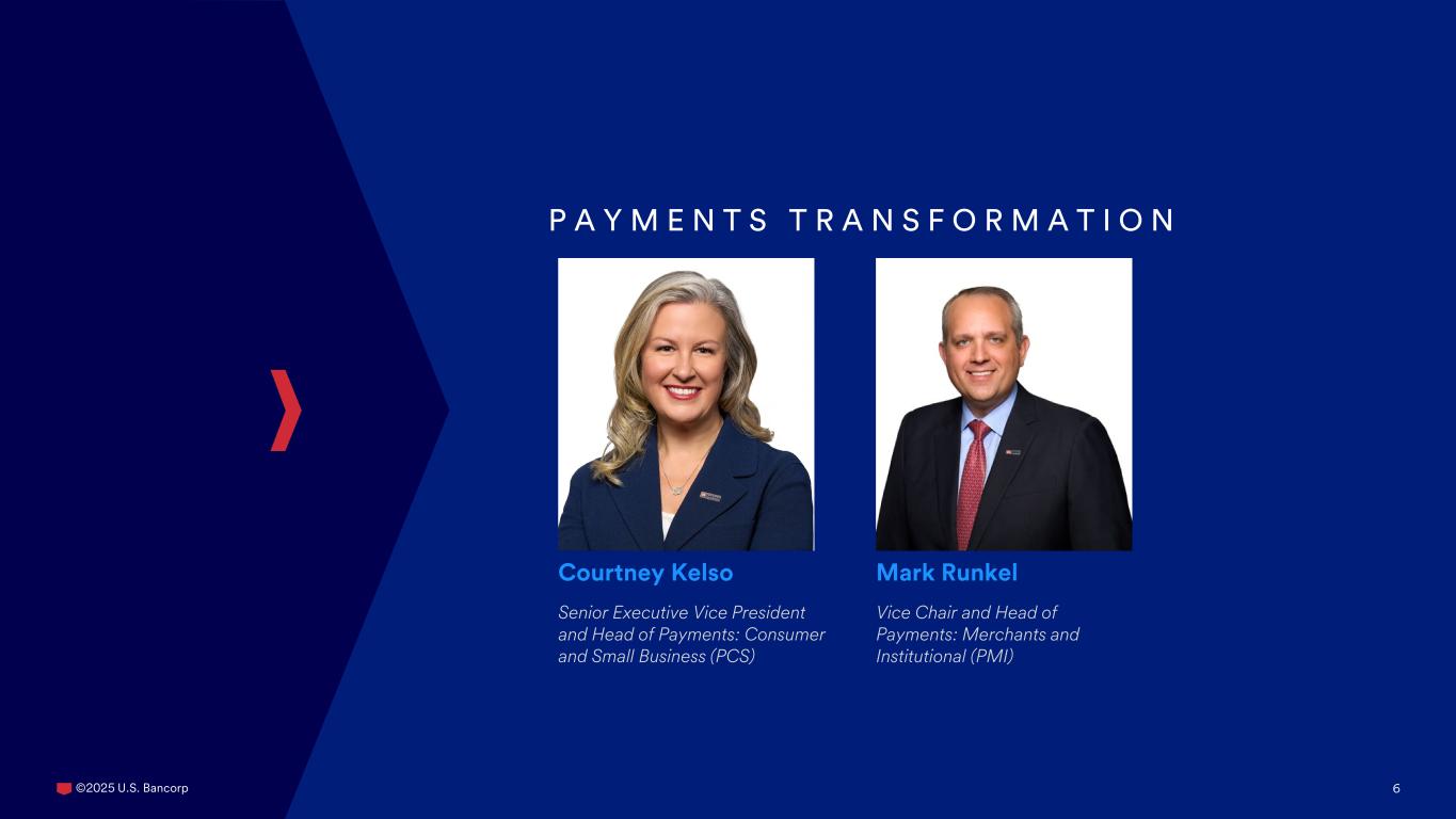©2025 U.S. Bancorp 6 P A Y M E N T S T R A N S F O R M A T I O N Mark Runkel Vice Chair and Head of Payments: Merchants and Institutional (PMI) Courtney Kelso Senior Executive Vice President and Head of Payments: Consumer and Small Business (PCS)