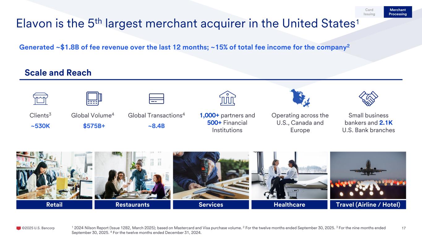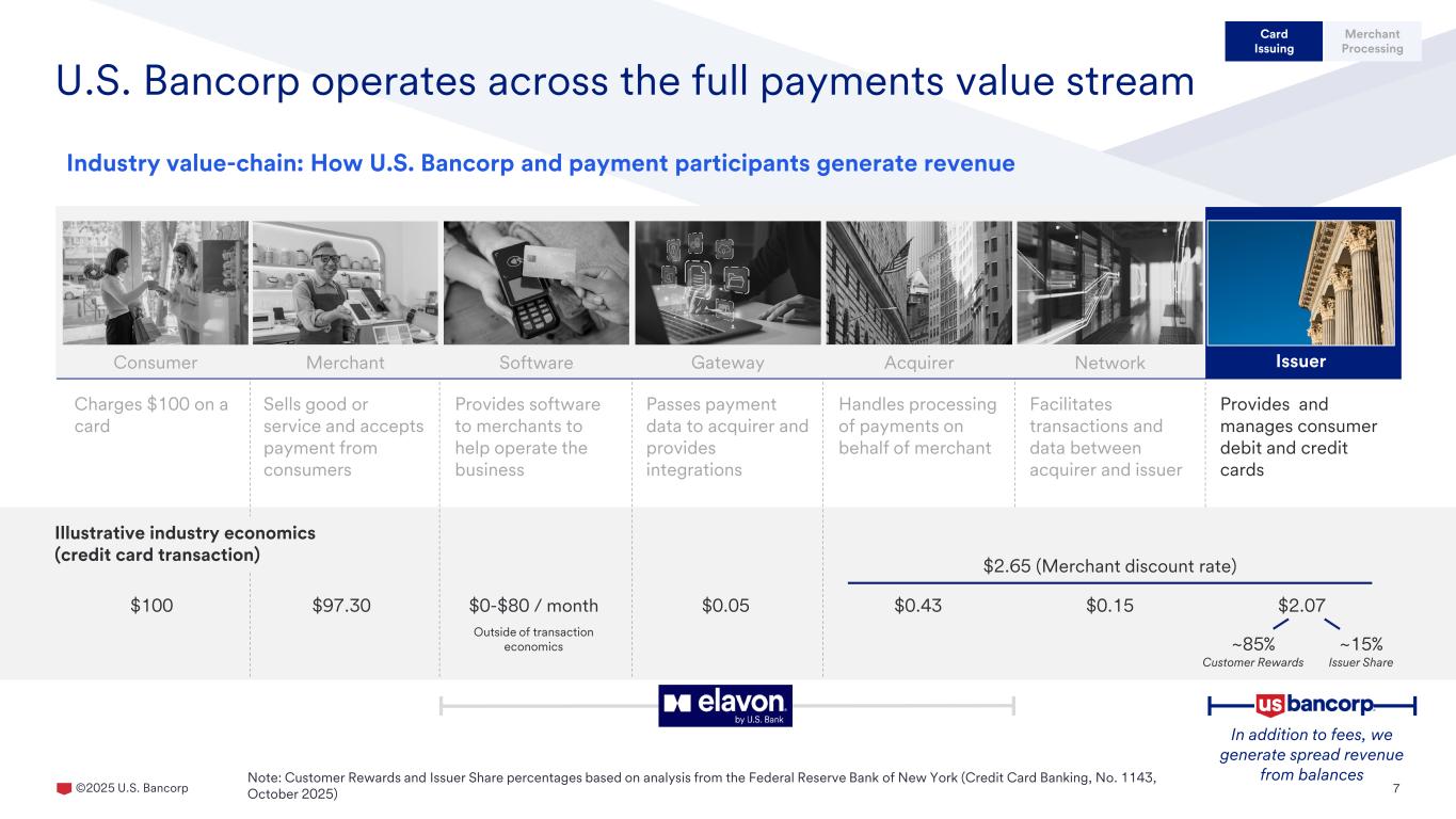©2025 U.S. Bancorp 16 U.S. Bancorp operates across the full payments value stream Industry value-chain: How U.S. Bancorp and payment participants generate revenue Consumer Merchant Acquirer Network IssuerSoftware Gateway Charges $100 on a card Sells good or service and accepts payment from consumers Handles processing of payments on behalf of merchant Facilitates transactions and data between acquirer and issuer Provides and manages consumer debit and credit cards Provides software to merchants to help operate the business Passes payment data to acquirer and provides integrations $100 $97.30 $0.43 $0.15 $2.07 Illustrative industry economics (credit card transaction) $2.65 (Merchant discount rate) $0.05 Outside of transaction economics $0-$80 / month Card Issuing Merchant Processing Note: Customer Rewards and Issuer Share percentages based on analysis from the Federal Reserve Bank of New York (Credit Card Banking, No. 1143, October 2025) ~85% Customer Rewards ~15% Issuer Share