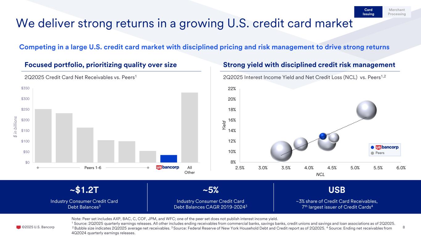 ©2025 U.S. Bancorp 7 U.S. Bancorp operates across the full payments value stream Industry value-chain: How U.S. Bancorp and payment participants generate revenue $100 $97.30 $0.43 $0.15 $2.07 Illustrative industry economics (credit card transaction) $2.65 (Merchant discount rate) $0.05 Outside of transaction economics $0-$80 / month Card Issuing Merchant Processing Consumer Merchant Acquirer Network IssuerSoftware Gateway Charges $100 on a card Sells good or service and accepts payment from consumers Handles processing of payments on behalf of merchant Facilitates transactions and data between acquirer and issuer Provides and manages consumer debit and credit cards Provides software to merchants to help operate the business Passes payment data to acquirer and provides integrations In addition to fees, we generate spread revenue from balances ~85% Customer Rewards ~15% Issuer Share Note: Customer Rewards and Issuer Share percentages based on analysis from the Federal Reserve Bank of New York (Credit Card Banking, No. 1143, October 2025)