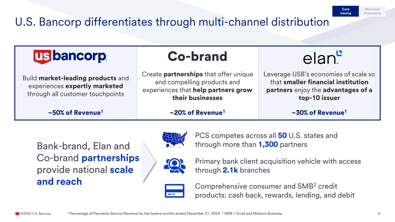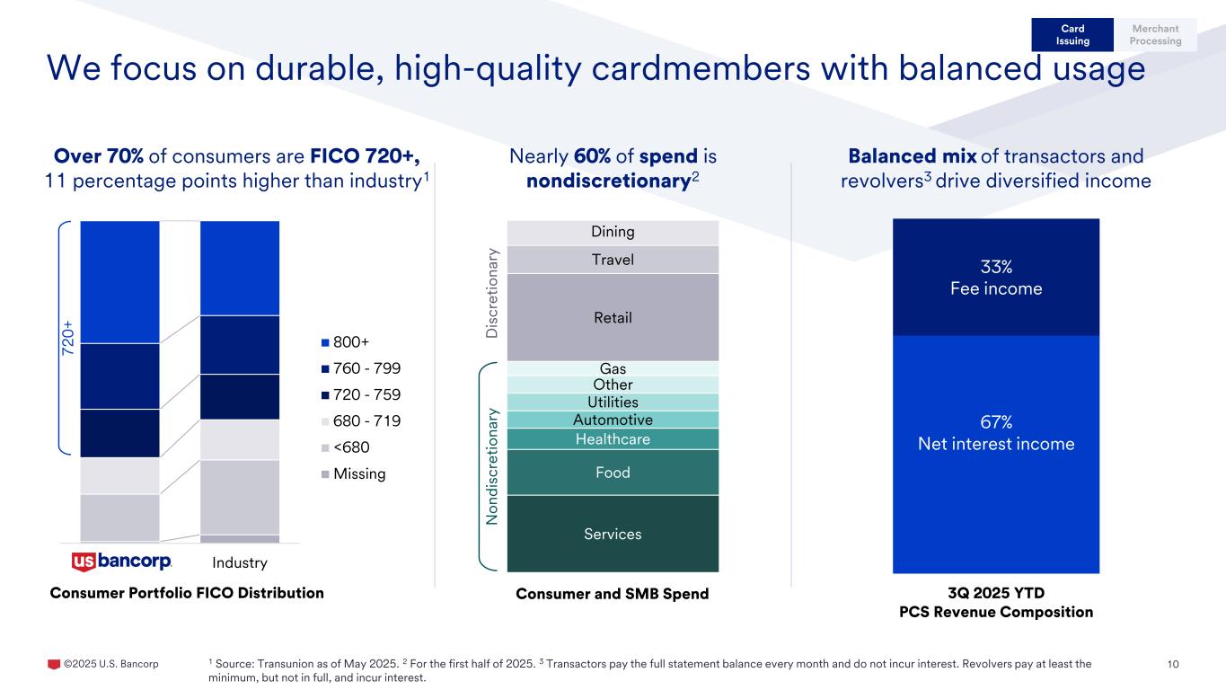 ©2025 U.S. Bancorp 9 U.S. Bancorp differentiates through multi-channel distribution Co-brand Build market-leading products and experiences expertly marketed through all customer touchpoints Create partnerships that offer unique and compelling products and experiences that help partners grow their businesses Leverage USB’s economies of scale so that smaller financial institution partners enjoy the advantages of a top-10 issuer ~50% of Revenue1 ~20% of Revenue1 ~30% of Revenue1 1 Percentage of Payments Service Revenue for the twelve months ended December 31, 2024. 2 SMB = Small and Medium Business. Card Issuing Merchant Processing PCS competes across all 50 U.S. states and through more than 1,300 partners Primary bank client acquisition vehicle with access through 2.1k branches Comprehensive consumer and SMB2 credit products: cash back, rewards, lending, and debit Bank-brand, Elan and Co-brand partnerships provide national scale and reach
