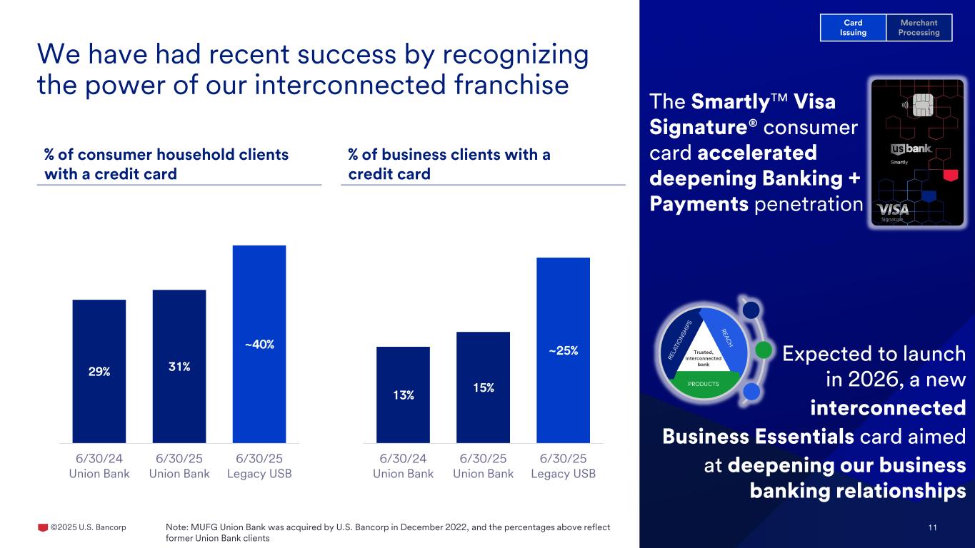 ©2025 U.S. Bancorp 10 We focus on durable, high-quality cardmembers with balanced usage 3Q 2025 YTD PCS Revenue Composition USB Industry Consumer Portfolio FICO Distribution 800+ 760 - 799 720 - 759 680 - 719 <680 Missing Over 70% of consumers are FICO 720+, 11 percentage points higher than industry1 Nearly 60% of spend is nondiscretionary2 N on di sc re tio na ry D is cr et io na ry 72 0+ Balanced mix of transactors and revolvers3 drive diversified income Services Food Healthcare Automotive Utilities Other Gas Retail Travel Dining Consumer and SMB Spend 33% Fee income 67% Net interest income 1 Source: Transunion as of May 2025. 2 For the first half of 2025. 3 Transactors pay the full statement balance every month and do not incur interest. Revolvers pay at least the minimum, but not in full, and incur interest. Card Issuing Merchant Processing