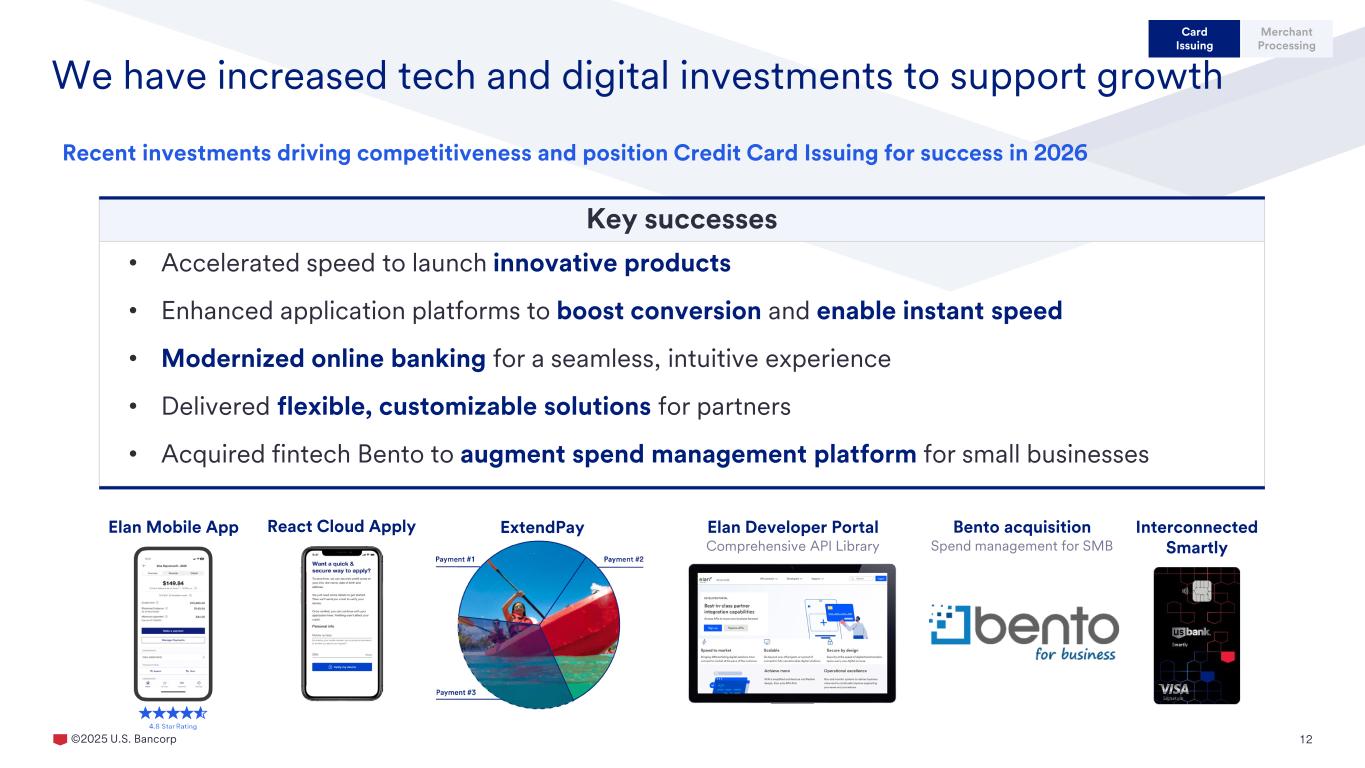 ©2025 U.S. Bancorp 12 We have increased tech and digital investments to support growth Recent investments driving competitiveness and position Credit Card Issuing for success in 2026 • Accelerated speed to launch innovative products • Enhanced application platforms to boost conversion and enable instant speed • Modernized online banking for a seamless, intuitive experience • Delivered flexible, customizable solutions for partners • Acquired fintech Bento to augment spend management platform for small businesses Key successes React Cloud ApplyElan Mobile App ExtendPay Elan Developer Portal Comprehensive API Library Interconnected Smartly Bento acquisition Spend management for SMB Card Issuing Merchant Processing