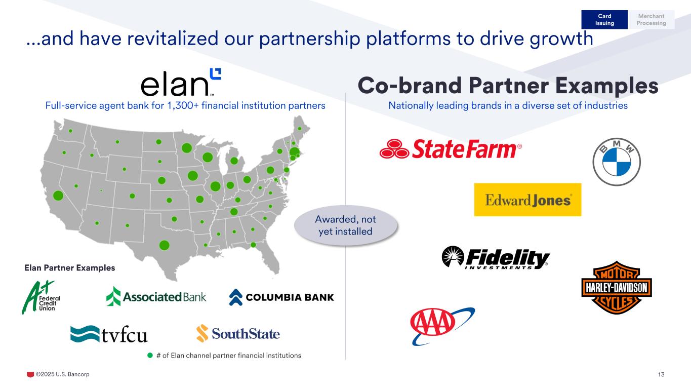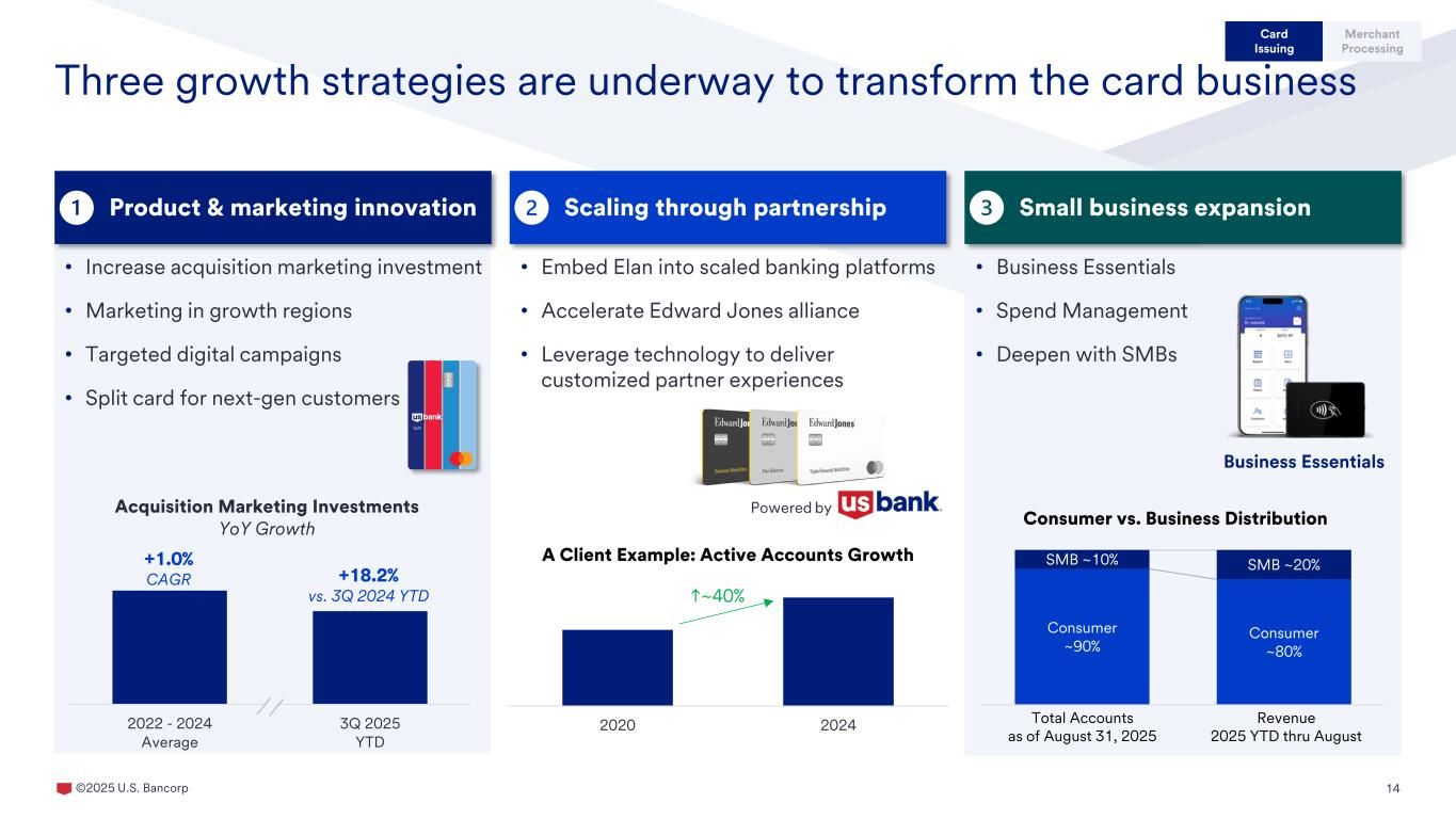 ©2025 U.S. Bancorp 13 …and have revitalized our partnership platforms to drive growth Co-brand Partner Examples Nationally leading brands in a diverse set of industries ● # of Elan channel partner financial institutions Full-service agent bank for 1,300+ financial institution partners Elan Partner Examples Awarded, not yet installed Card Issuing Merchant Processing