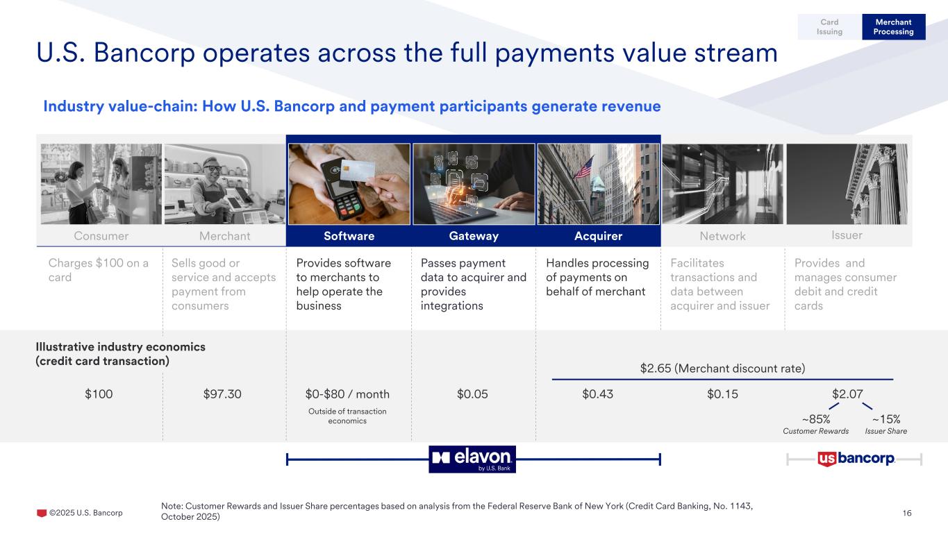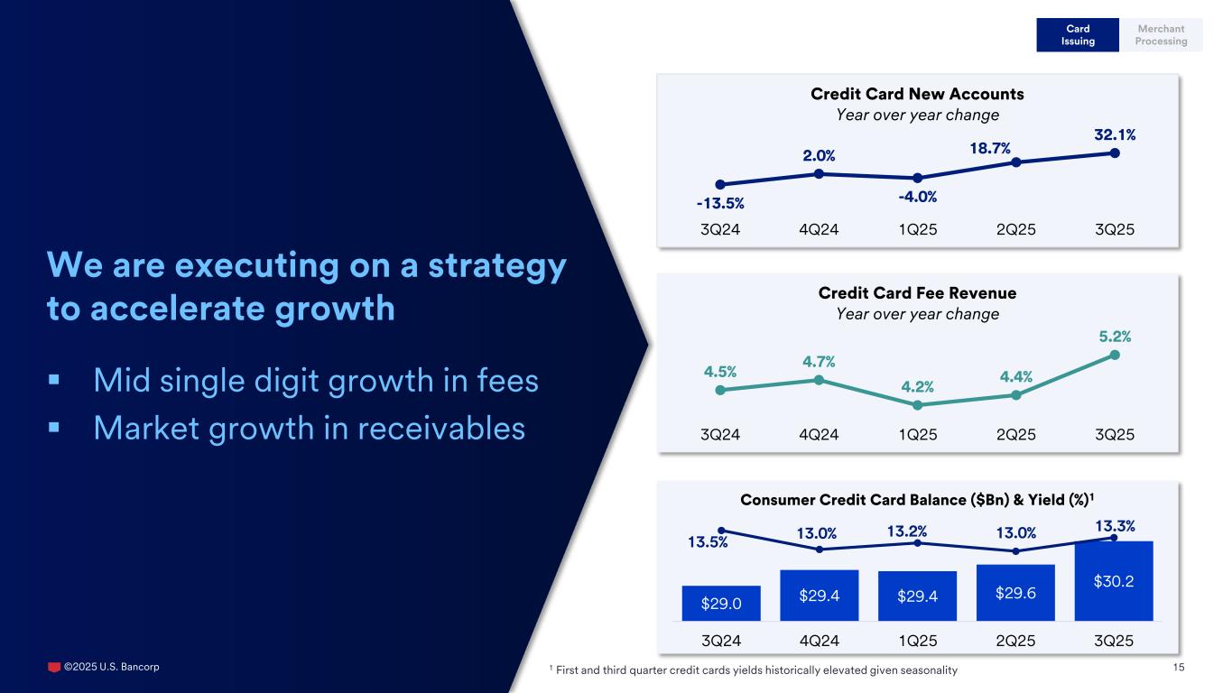 ©2025 U.S. Bancorp 15 We are executing on a strategy to accelerate growth  Mid single digit growth in fees  Market growth in receivables -13.5% 2.0% -4.0% 18.7% 32.1% 3Q24 4Q24 1Q25 2Q25 3Q25 Credit Card New Accounts Year over year change 4.5% 4.7% 4.2% 4.4% 5.2% 3Q24 4Q24 1Q25 2Q25 3Q25 Credit Card Fee Revenue Year over year change $29.0 $29.4 $29.4 $29.6 $30.2 13.5% 13.0% 13.2% 13.0% 13.3% 3Q24 4Q24 1Q25 2Q25 3Q25 Consumer Credit Card Balance ($Bn) & Yield (%)1 1 First and third quarter credit cards yields historically elevated given seasonality Card Issuing Merchant Processing