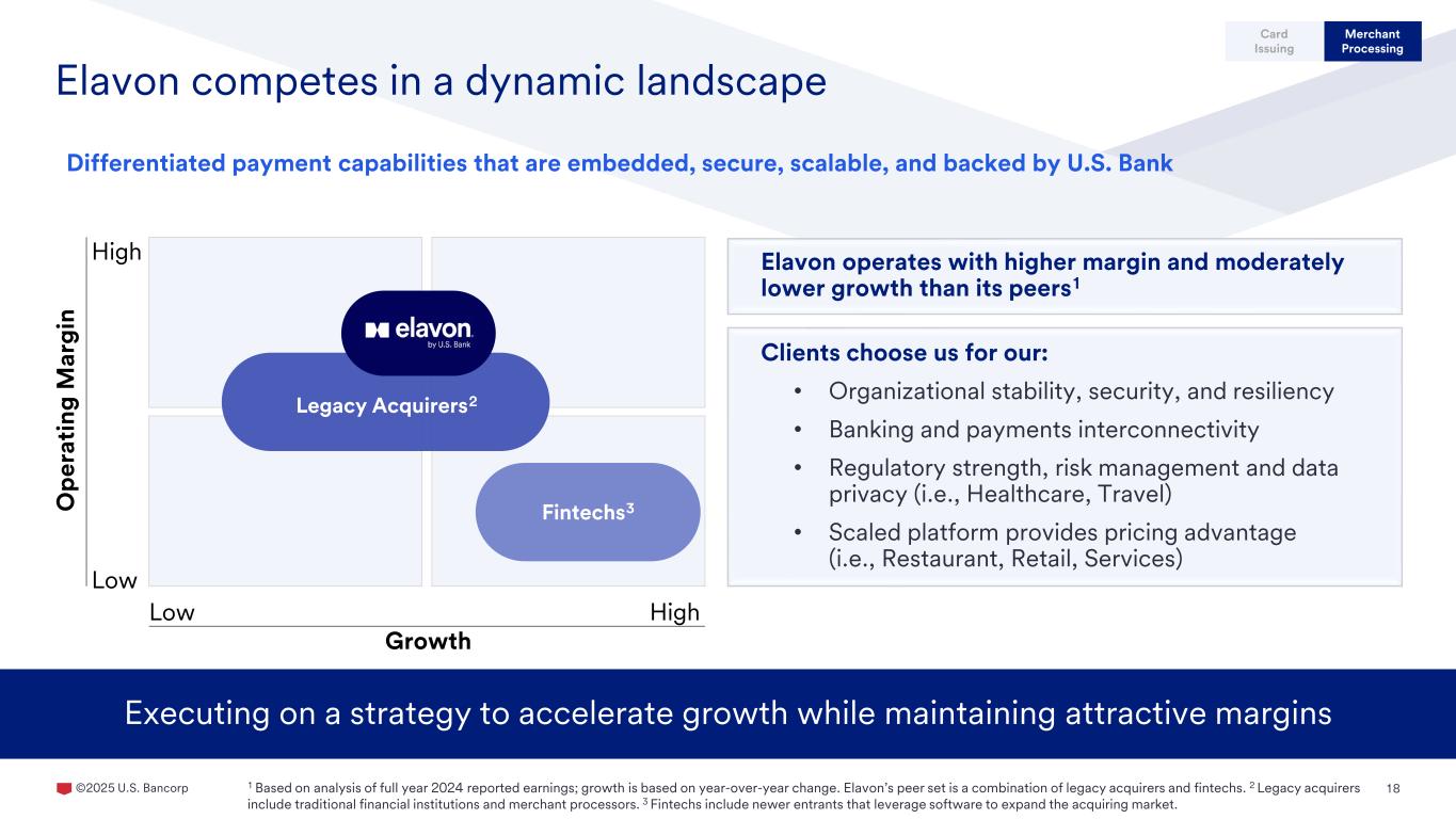 ©2025 U.S. Bancorp 17 Elavon is the 5th largest merchant acquirer in the United States1 Generated ~$1.8B of fee revenue over the last 12 months; ~15% of total fee income for the company2 Small business bankers and 2.1K U.S. Bank branches Clients3 Global Transactions4Global Volume4 $575B+~530K ~8.4B Operating across the U.S., Canada and Europe 1,000+ partners and 500+ Financial Institutions Scale and Reach Retail Healthcare Travel (Airline / Hotel)Restaurants Services 1 2024 Nilson Report (Issue 1282, March 2025); based on Mastercard and Visa purchase volume. 2 For the twelve months ended September 30, 2025. 3 For the nine months ended September 30, 2025. 4 For the twelve months ended December 31, 2024. Card Issuing Merchant Processing