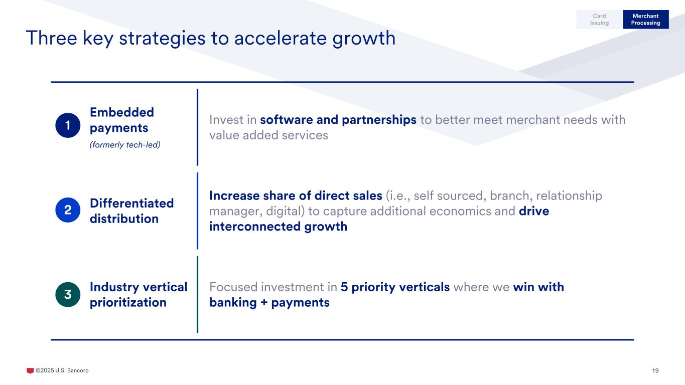 ©2025 U.S. Bancorp 18 Elavon competes in a dynamic landscape Differentiated payment capabilities that are embedded, secure, scalable, and backed by U.S. Bank 1 Based on analysis of full year 2024 reported earnings; growth is based on year-over-year change. Elavon’s peer set is a combination of legacy acquirers and fintechs. 2 Legacy acquirers include traditional financial institutions and merchant processors. 3 Fintechs include newer entrants that leverage software to expand the acquiring market. Growth HighLow O pe ra ti ng M ar gi n Low High Legacy Acquirers2 Fintechs3 Elavon operates with higher margin and moderately lower growth than its peers1 Clients choose us for our: • Organizational stability, security, and resiliency • Banking and payments interconnectivity • Regulatory strength, risk management and data privacy (i.e., Healthcare, Travel) • Scaled platform provides pricing advantage (i.e., Restaurant, Retail, Services) Executing on a strategy to accelerate growth while maintaining attractive margins Card Issuing Merchant Processing