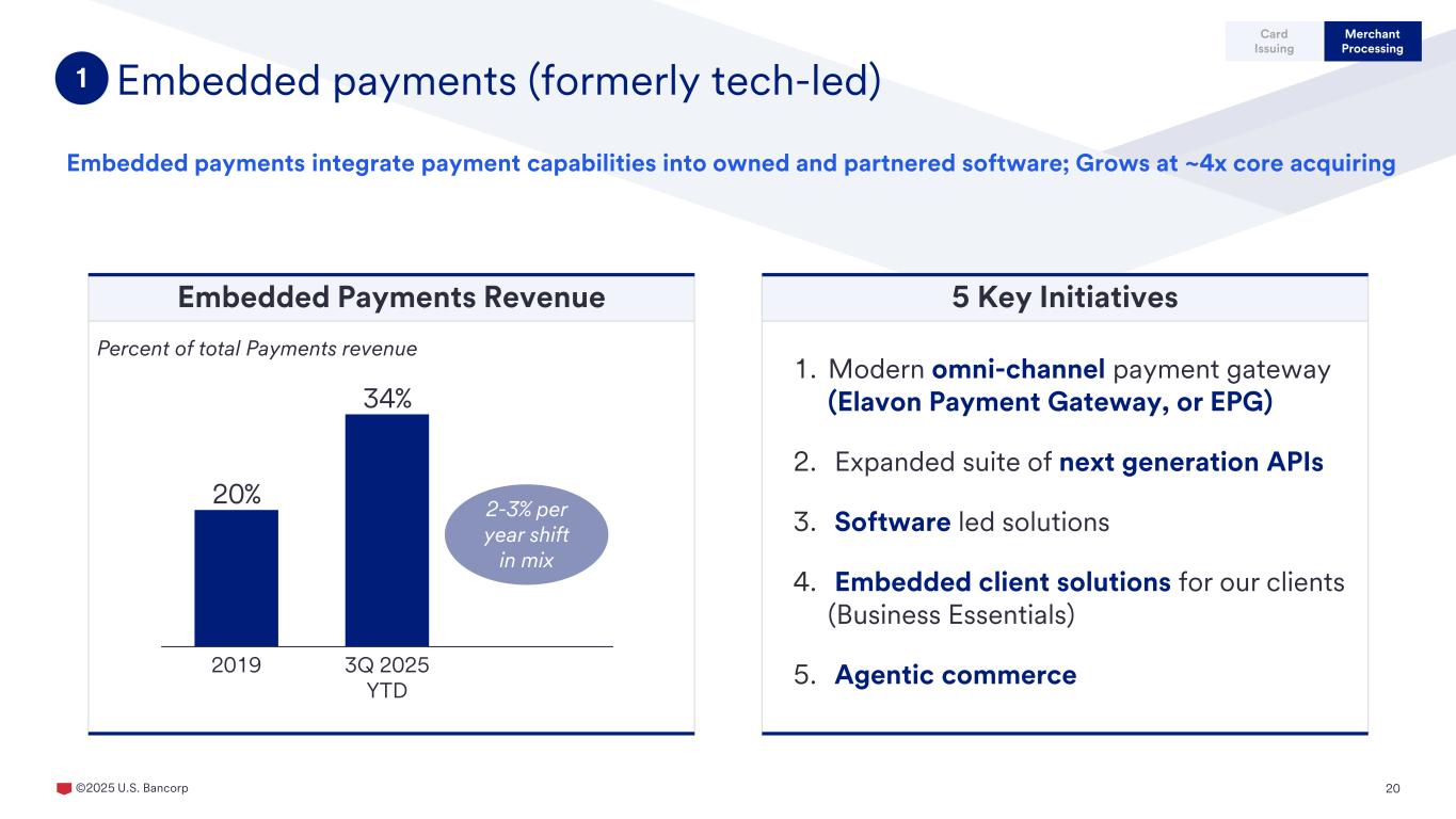 ©2025 U.S. Bancorp 19 Three key strategies to accelerate growth Embedded payments (formerly tech-led) Invest in software and partnerships to better meet merchant needs with value added services Differentiated distribution Increase share of direct sales (i.e., self sourced, branch, relationship manager, digital) to capture additional economics and drive interconnected growth Industry vertical prioritization Focused investment in 5 priority verticals where we win with banking + payments 2 3 1 Card Issuing Merchant Processing