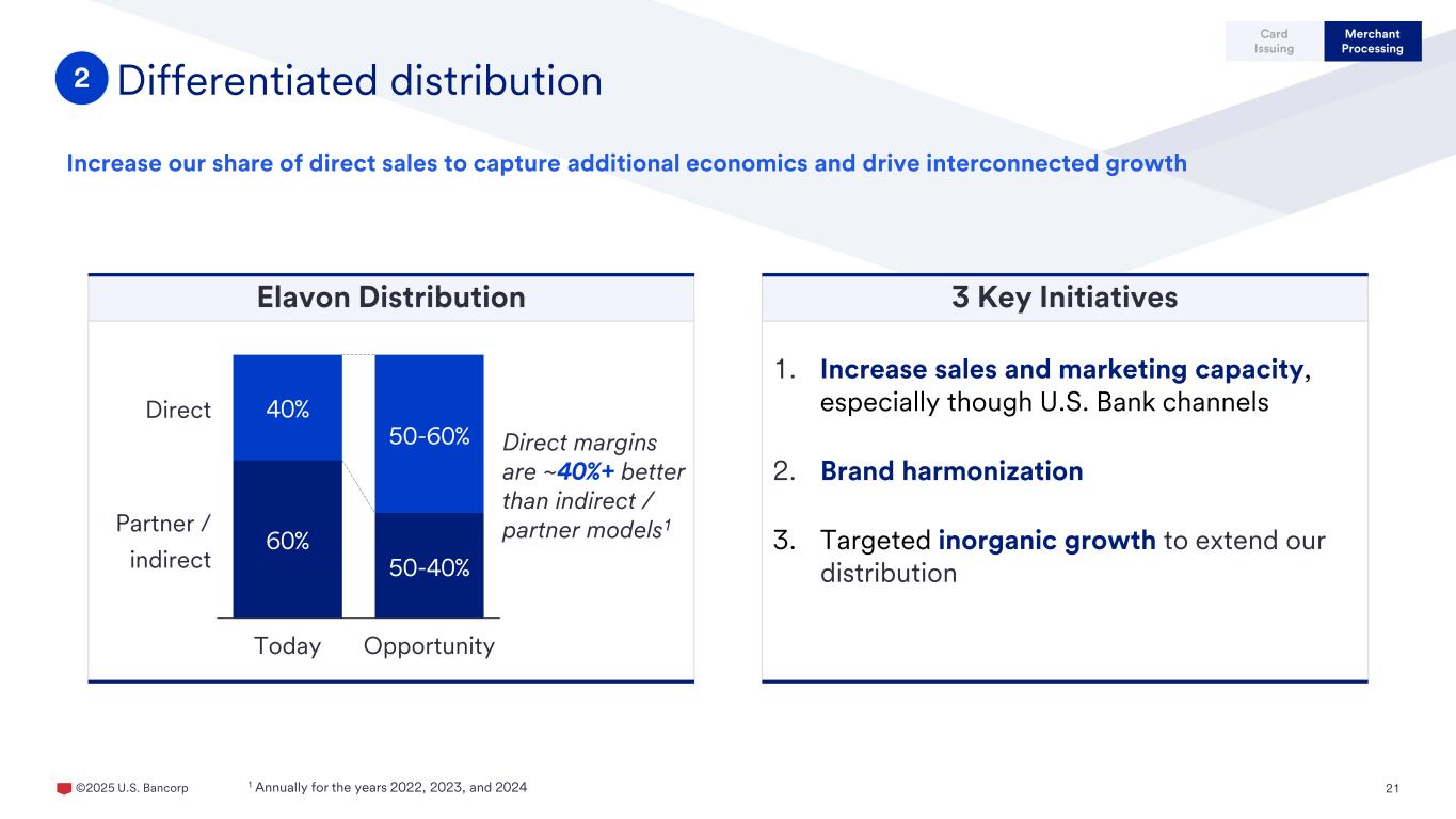 ©2025 U.S. Bancorp 20 Embedded payments (formerly tech-led) Embedded payments integrate payment capabilities into owned and partnered software; Grows at ~4x core acquiring 2019 3Q 2025 YTD 20% 34% Percent of total Payments revenue 2-3% per year shift in mix 1. Modern omni-channel payment gateway (Elavon Payment Gateway, or EPG) 2. Expanded suite of next generation APIs 3. Software led solutions 4. Embedded client solutions for our clients (Business Essentials) 5. Agentic commerce 5 Key InitiativesEmbedded Payments Revenue 1 Card Issuing Merchant Processing
