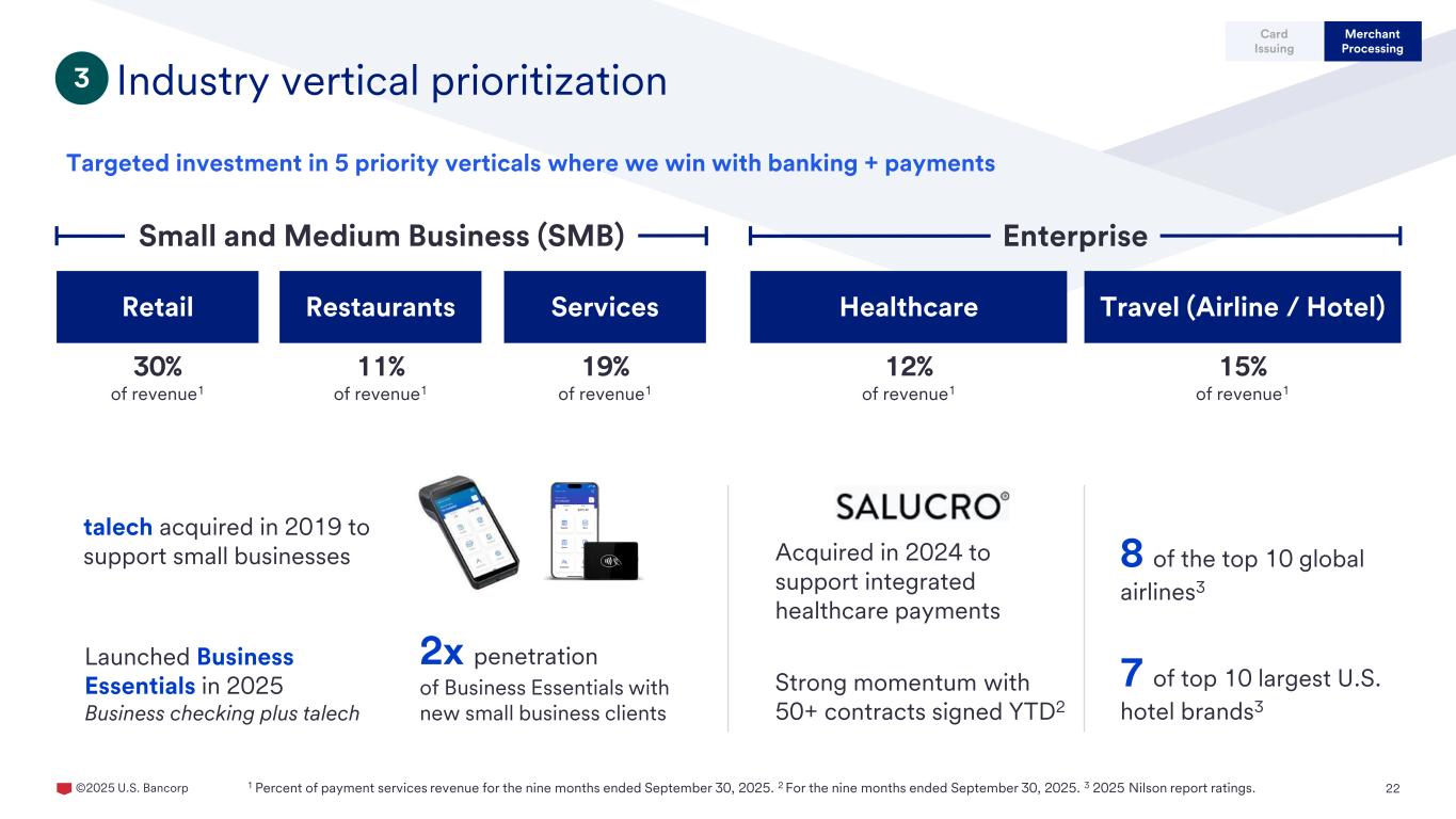 ©2025 U.S. Bancorp 22 Industry vertical prioritization Targeted investment in 5 priority verticals where we win with banking + payments 3 Retail Healthcare Travel (Airline / Hotel)Restaurants Services Small and Medium Business (SMB) Enterprise 30% of revenue1 11% of revenue1 19% of revenue1 12% of revenue1 15% of revenue1 1 Percent of payment services revenue for the nine months ended September 30, 2025. 2 For the nine months ended September 30, 2025. 3 2025 Nilson report ratings. 7 of top 10 largest U.S. hotel brands3 8 of the top 10 global airlines3 Acquired in 2024 to support integrated healthcare payments talech acquired in 2019 to support small businesses 2x penetration of Business Essentials with new small business clients Launched Business Essentials in 2025 Business checking plus talech Strong momentum with 50+ contracts signed YTD2 Card Issuing Merchant Processing