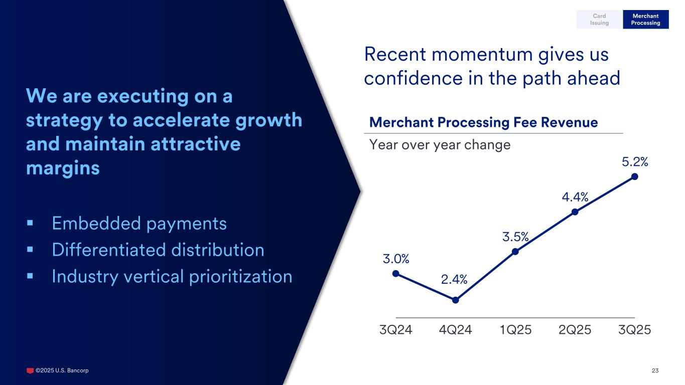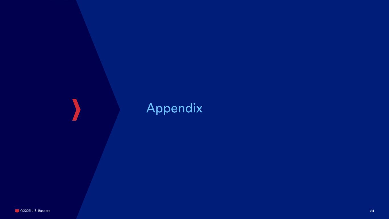 ©2025 U.S. Bancorp 23 We are executing on a strategy to accelerate growth and maintain attractive margins  Embedded payments  Differentiated distribution  Industry vertical prioritization Merchant Processing Fee Revenue Year over year change 3.0% 3Q24 2.4% 4Q24 3.5% 1Q25 4.4% 2Q25 5.2% 3Q25 Recent momentum gives us confidence in the path ahead Card Issuing Merchant Processing