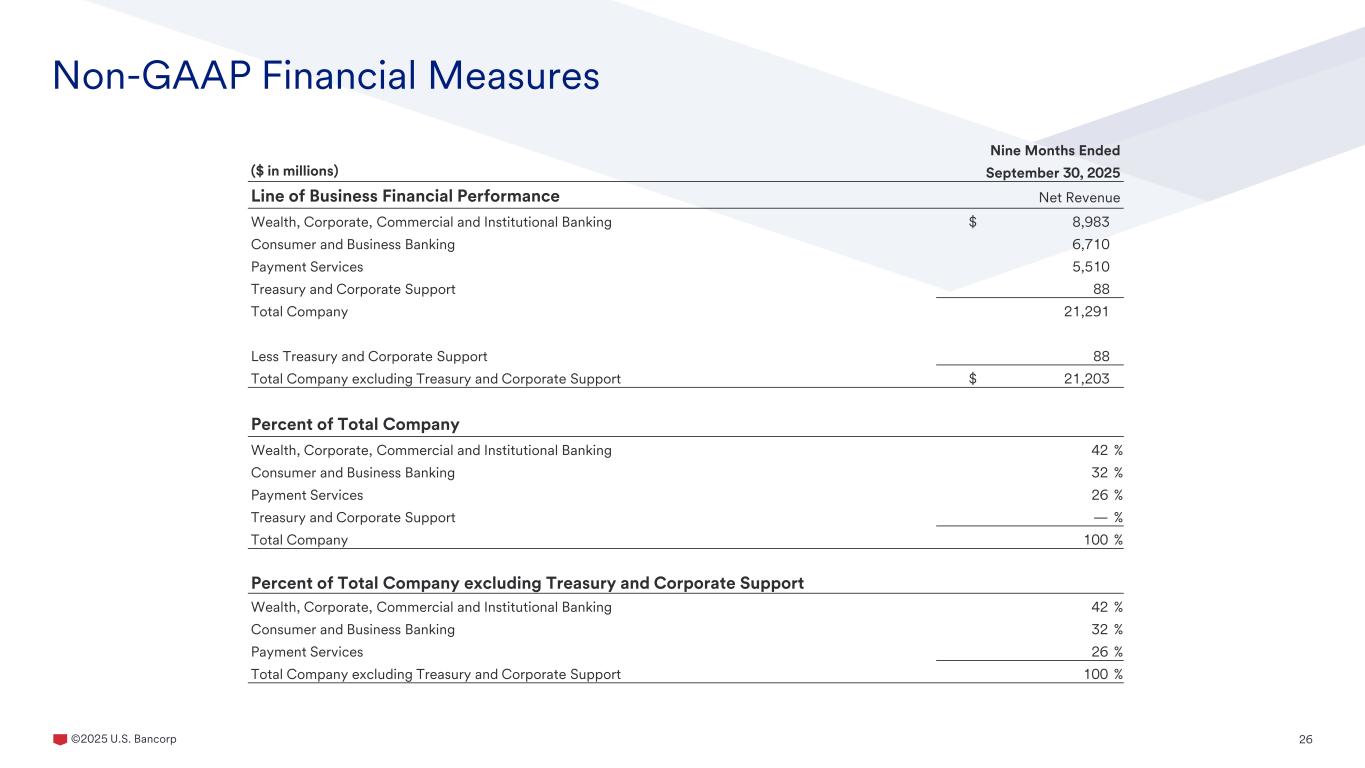 ©2025 U.S. Bancorp 26 Non-GAAP Financial Measures ($ in millions) Nine Months Ended September 30, 2025 Line of Business Financial Performance Net Revenue Wealth, Corporate, Commercial and Institutional Banking $ 8,983 Consumer and Business Banking 6,710 Payment Services 5,510 Treasury and Corporate Support 88 Total Company 21,291 Less Treasury and Corporate Support 88 Total Company excluding Treasury and Corporate Support $ 21,203 Percent of Total Company Wealth, Corporate, Commercial and Institutional Banking 42 % Consumer and Business Banking 32 % Payment Services 26 % Treasury and Corporate Support — % Total Company 100 % Percent of Total Company excluding Treasury and Corporate Support Wealth, Corporate, Commercial and Institutional Banking 42 % Consumer and Business Banking 32 % Payment Services 26 % Total Company excluding Treasury and Corporate Support 100 %
