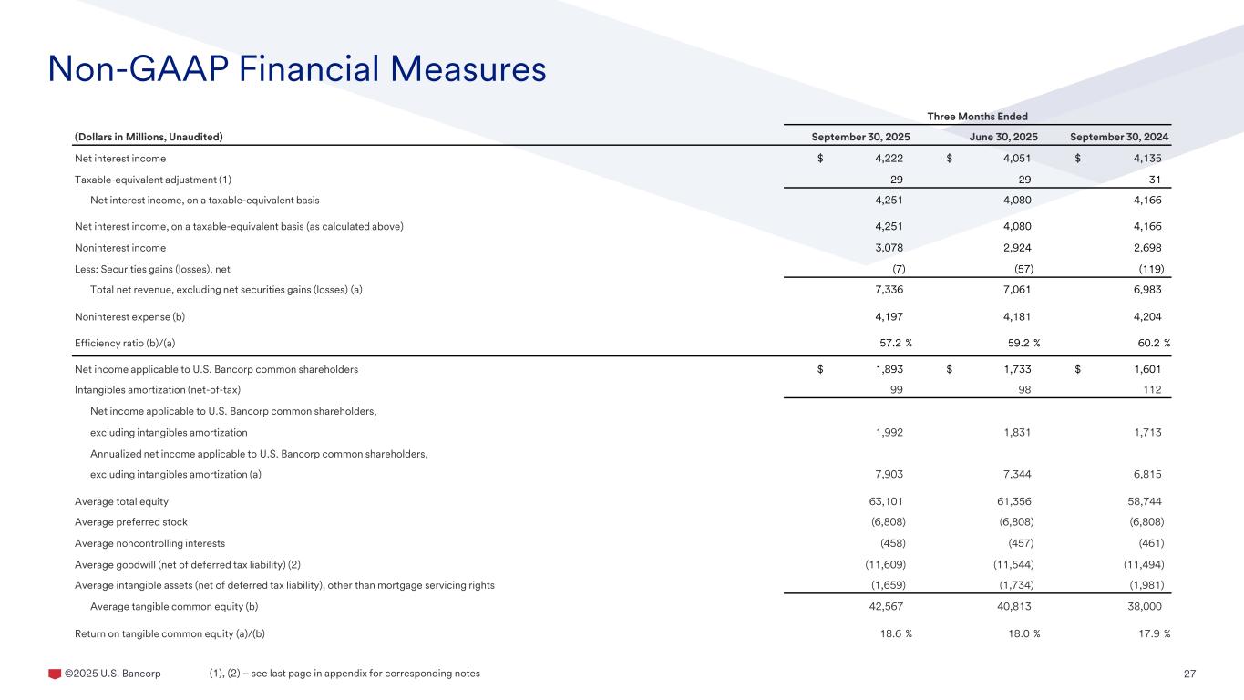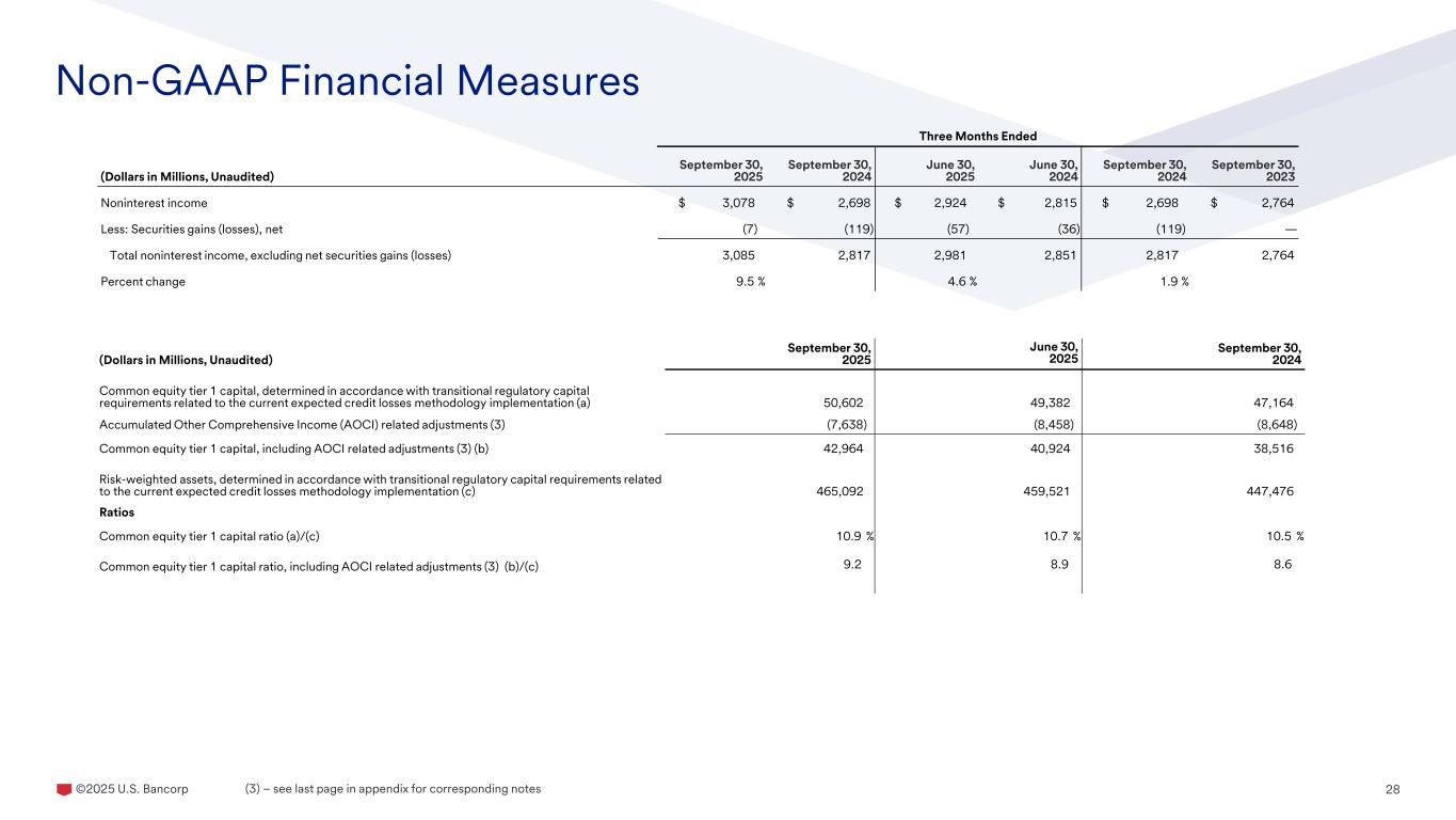 ©2025 U.S. Bancorp 27 Non-GAAP Financial Measures Three Months Ended (Dollars in Millions, Unaudited) September 30, 2025 June 30, 2025 September 30, 2024 Net interest income $ 4,222 $ 4,051 $ 4,135 Taxable-equivalent adjustment (1) 29 29 31 Net interest income, on a taxable-equivalent basis 4,251 4,080 4,166 Net interest income, on a taxable-equivalent basis (as calculated above) 4,251 4,080 4,166 Noninterest income 3,078 2,924 2,698 Less: Securities gains (losses), net (7) (57) (119) Total net revenue, excluding net securities gains (losses) (a) 7,336 7,061 6,983 Noninterest expense (b) 4,197 4,181 4,204 Efficiency ratio (b)/(a) 57.2 % 59.2 % 60.2 % Net income applicable to U.S. Bancorp common shareholders $ 1,893 $ 1,733 $ 1,601 Intangibles amortization (net-of-tax) 99 98 112 Net income applicable to U.S. Bancorp common shareholders, excluding intangibles amortization 1,992 1,831 1,713 Annualized net income applicable to U.S. Bancorp common shareholders, excluding intangibles amortization (a) 7,903 7,344 6,815 Average total equity 63,101 61,356 58,744 Average preferred stock (6,808) (6,808) (6,808) Average noncontrolling interests (458) (457) (461) Average goodwill (net of deferred tax liability) (2) (11,609) (11,544) (11,494) Average intangible assets (net of deferred tax liability), other than mortgage servicing rights (1,659) (1,734) (1,981) Average tangible common equity (b) 42,567 40,813 38,000 Return on tangible common equity (a)/(b) 18.6 % 18.0 % 17.9 % (1), (2) – see last page in appendix for corresponding notes