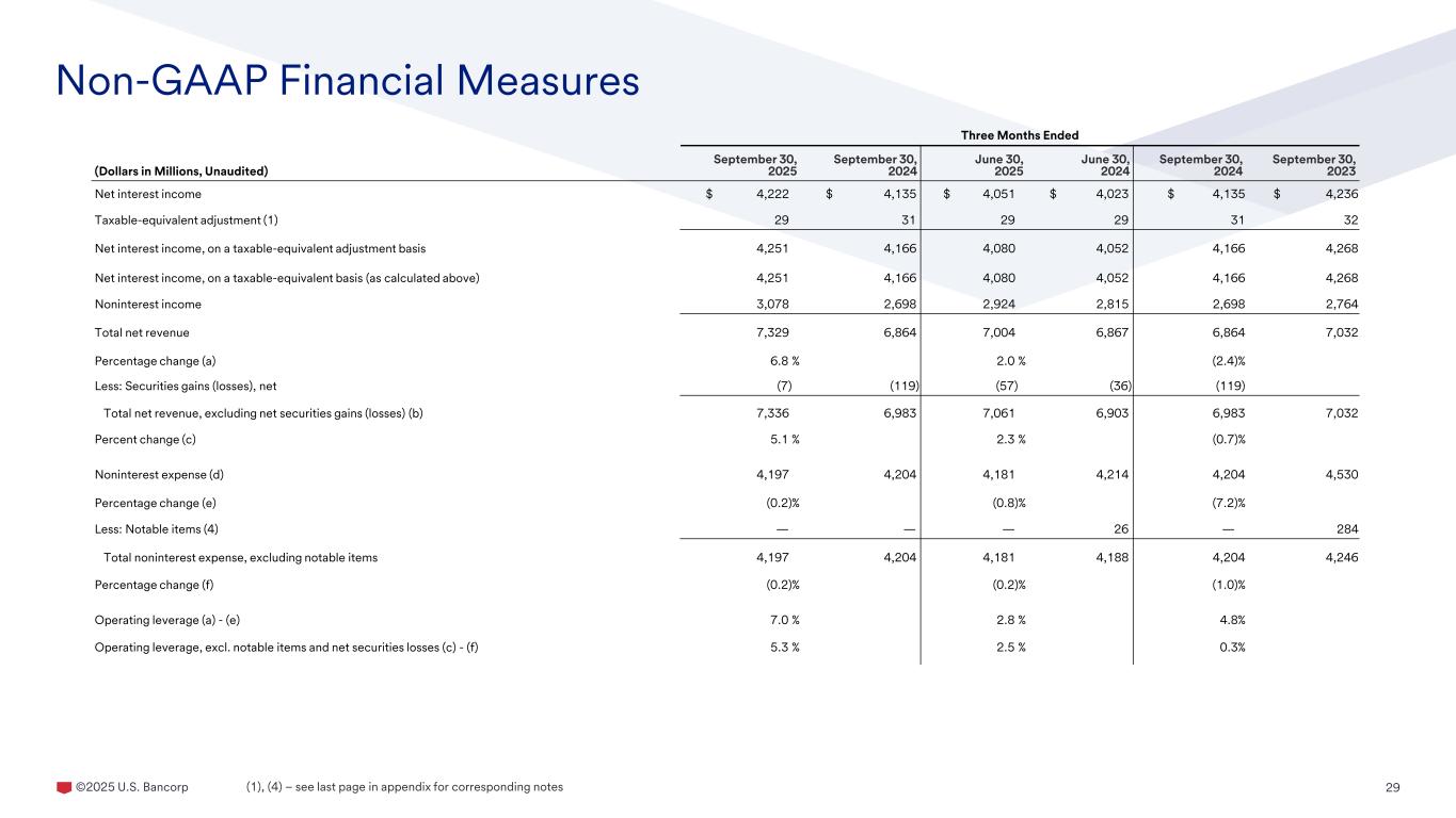 ©2025 U.S. Bancorp 29 Non-GAAP Financial Measures Three Months Ended (Dollars in Millions, Unaudited) September 30, 2025 September 30, 2024 June 30, 2025 June 30, 2024 September 30, 2024 September 30, 2023 Net interest income $ 4,222 $ 4,135 $ 4,051 $ 4,023 $ 4,135 $ 4,236 Taxable-equivalent adjustment (1) 29 31 29 29 31 32 Net interest income, on a taxable-equivalent adjustment basis 4,251 4,166 4,080 4,052 4,166 4,268 Net interest income, on a taxable-equivalent basis (as calculated above) 4,251 4,166 4,080 4,052 4,166 4,268 Noninterest income 3,078 2,698 2,924 2,815 2,698 2,764 Total net revenue 7,329 6,864 7,004 6,867 6,864 7,032 Percentage change (a) 6.8 % 2.0 % (2.4)% Less: Securities gains (losses), net (7) (119) (57) (36) (119) Total net revenue, excluding net securities gains (losses) (b) 7,336 6,983 7,061 6,903 6,983 7,032 Percent change (c) 5.1 % 2.3 % (0.7)% Noninterest expense (d) 4,197 4,204 4,181 4,214 4,204 4,530 Percentage change (e) (0.2)% (0.8)% (7.2)% Less: Notable items (4) — — — 26 — 284 Total noninterest expense, excluding notable items 4,197 4,204 4,181 4,188 4,204 4,246 Percentage change (f) (0.2)% (0.2)% (1.0)% Operating leverage (a) - (e) 7.0 % 2.8 % 4.8% Operating leverage, excl. notable items and net securities losses (c) - (f) 5.3 % 2.5 % 0.3% (1), (4) – see last page in appendix for corresponding notes