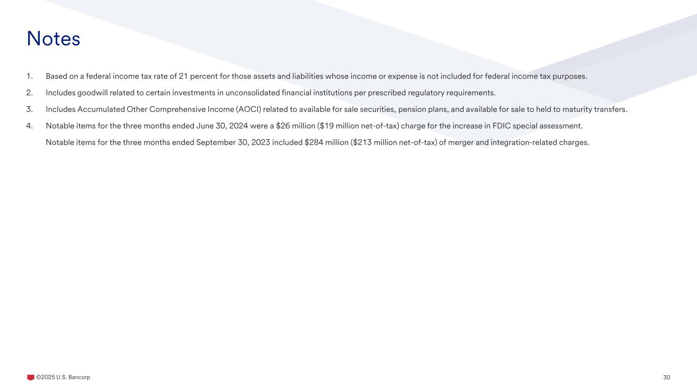 ©2025 U.S. Bancorp 30 Notes 1. Based on a federal income tax rate of 21 percent for those assets and liabilities whose income or expense is not included for federal income tax purposes. 2. Includes goodwill related to certain investments in unconsolidated financial institutions per prescribed regulatory requirements. 3. Includes Accumulated Other Comprehensive Income (AOCI) related to available for sale securities, pension plans, and available for sale to held to maturity transfers. 4. Notable items for the three months ended June 30, 2024 were a $26 million ($19 million net-of-tax) charge for the increase in FDIC special assessment. Notable items for the three months ended September 30, 2023 included $284 million ($213 million net-of-tax) of merger and integration-related charges.