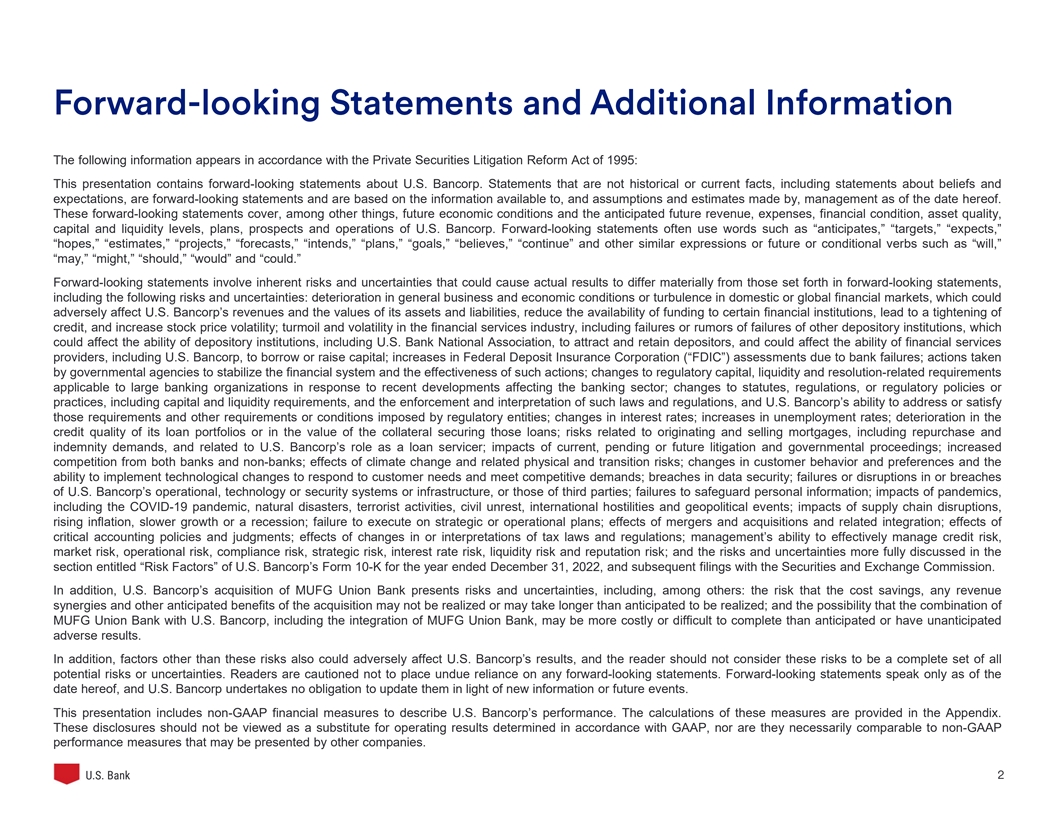 Forward-looking Statements and Additional Information ThefollowinginformationappearsinaccordancewiththePrivateSecuritiesLitigationReformActof1995: Thispresentationcontainsforward-lookingstatementsaboutU.S.Bancorp.Statementsthatarenothistoricalorcurrentfacts,includingstatementsaboutbeliefsand expectations,areforward-lookingstatementsandarebasedontheinformationavailableto,andassumptionsandestimatesmadeby,managementasofthedatehereof. Theseforward-lookingstatementscover,amongotherthings,futureeconomicconditionsandtheanticipatedfuturerevenue,expenses,financialcondition,assetquality, capitalandliquiditylevels,plans,prospectsandoperationsofU.S.Bancorp.Forward-lookingstatementsoftenusewordssuchas“anticipates,”“targets,”“expects,” “hopes,”“estimates,”“projects,”“forecasts,”“intends,”“plans,”“goals,”“believes,”“continue”andothersimilarexpressionsorfutureorconditionalverbssuchas“will,” “may,”“might,”“should,”“would”and“could.” Forward-lookingstatementsinvolveinherentrisksanduncertaintiesthatcouldcauseactualresultstodiffermateriallyfromthosesetforthinforward-lookingstatements, includingthefollowingrisksanduncertainties:deteriorationingeneralbusinessandeconomicconditionsorturbulenceindomesticorglobalfinancialmarkets,whichcould adverselyaffectU.S.Bancorp’srevenuesandthevaluesofitsassetsandliabilities,reducetheavailabilityoffundingtocertainfinancialinstitutions,leadtoatighteningof credit,andincreasestockpricevolatility;turmoilandvolatilityinthefinancialservicesindustry,includingfailuresorrumorsoffailuresofotherdepositoryinstitutions,which couldaffecttheabilityofdepositoryinstitutions,includingU.S.BankNationalAssociation,toattractandretaindepositors,andcouldaffecttheabilityoffinancialservices providers,includingU.S.Bancorp,toborroworraisecapital;increasesinFederalDepositInsuranceCorporation(“FDIC”)assessmentsduetobankfailures;actionstaken bygovernmentalagenciestostabilizethefinancialsystemandtheeffectivenessofsuchactions;changestoregulatorycapital,liquidityandresolution-relatedrequirements applicabletolargebankingorganizationsinresponsetorecentdevelopmentsaffectingthebankingsector;changestostatutes,regulations,orregulatorypoliciesor practices,includingcapitalandliquidityrequirements,andtheenforcementandinterpretationofsuchlawsandregulations,andU.S.Bancorp’sabilitytoaddressorsatisfy thoserequirementsandotherrequirementsorconditionsimposedbyregulatoryentities;changesininterestrates;increasesinunemploymentrates;deteriorationinthe creditqualityofitsloanportfoliosorinthevalueofthecollateralsecuringthoseloans;risksrelatedtooriginatingandsellingmortgages,includingrepurchaseand indemnitydemands,andrelatedtoU.S.Bancorp’sroleasaloanservicer;impactsofcurrent,pendingorfuturelitigationandgovernmentalproceedings;increased competitionfrombothbanksandnon-banks;effectsofclimatechangeandrelatedphysicalandtransitionrisks;changesincustomerbehaviorandpreferencesandthe abilitytoimplementtechnologicalchangestorespondtocustomerneedsandmeetcompetitivedemands;breachesindatasecurity;failuresordisruptionsinorbreaches ofU.S.Bancorp’soperational,technologyorsecuritysystemsorinfrastructure,orthoseofthirdparties;failurestosafeguardpersonalinformation;impactsofpandemics, includingtheCOVID-19pandemic,naturaldisasters,terroristactivities,civilunrest,internationalhostilitiesandgeopoliticalevents;impactsofsupplychaindisruptions, risinginflation,slowergrowthorarecession;failuretoexecuteonstrategicoroperationalplans;effectsofmergersandacquisitionsandrelatedintegration;effectsof criticalaccountingpoliciesandjudgments;effectsofchangesinorinterpretationsoftaxlawsandregulations;management’sabilitytoeffectivelymanagecreditrisk, marketrisk,operationalrisk,compliancerisk,strategicrisk,interestraterisk,liquidityriskandreputationrisk;andtherisksanduncertaintiesmorefullydiscussedinthe sectionentitled“RiskFactors”ofU.S.Bancorp’sForm10-KfortheyearendedDecember31,2022,andsubsequentfilingswiththeSecuritiesandExchangeCommission. Inaddition,U.S.Bancorp’sacquisitionofMUFGUnionBankpresentsrisksanduncertainties,including,amongothers:theriskthatthecostsavings,anyrevenue synergiesandotheranticipatedbenefitsoftheacquisitionmaynotberealizedormaytakelongerthananticipatedtoberealized;andthepossibilitythatthecombinationof MUFGUnionBankwithU.S.Bancorp,includingtheintegrationofMUFGUnionBank,maybemorecostlyordifficulttocompletethananticipatedorhaveunanticipated adverseresults. Inaddition,factorsotherthantheserisksalsocouldadverselyaffectU.S.Bancorp’sresults,andthereadershouldnotconsidertheseriskstobeacompletesetofall potentialrisksoruncertainties.Readersarecautionednottoplaceunduerelianceonanyforward-lookingstatements.Forward-lookingstatementsspeakonlyasofthe datehereof,andU.S.Bancorpundertakesnoobligationtoupdatetheminlightofnewinformationorfutureevents. Thispresentationincludesnon-GAAPfinancialmeasurestodescribeU.S.Bancorp’sperformance.ThecalculationsofthesemeasuresareprovidedintheAppendix. ThesedisclosuresshouldnotbeviewedasasubstituteforoperatingresultsdeterminedinaccordancewithGAAP,noraretheynecessarilycomparabletonon-GAAP performancemeasuresthatmaybepresentedbyothercompanies. 2 U.S. Bank