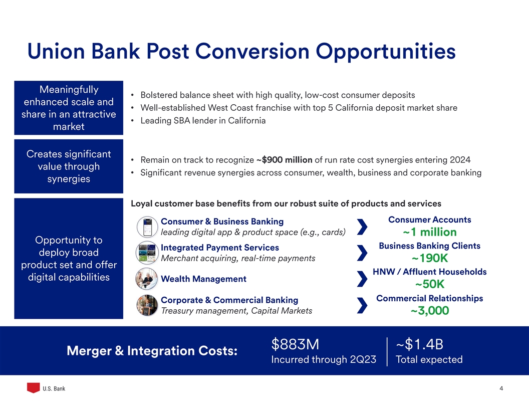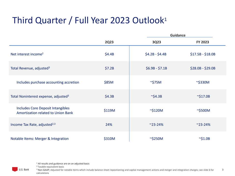 1 Third Quarter / Full Year 2023 Outlook Guidance 2Q23 3Q23 FY 2023 2 Net interest income $4.4B $4.2B - $4.4B $17.5B - $18.0B 3 Total Revenue, adjusted $7.2B $6.9B - $7.1B $28.0B - $29.0B Includes purchase accounting accretion $85M ~$75M ~$330M 3 Total Noninterest expense, adjusted $4.3B ~$4.3B ~$17.0B Includes Core Deposit Intangibles $119M ~$120M ~$500M Amortization related to Union Bank 2,3 Income Tax Rate, adjusted 24% ~23-24% ~23-24% Notable Items: Merger & Integration $310M ~$250M ~$1.0B 1 All results and guidance are on an adjusted basis 2 Taxable-equivalent basis 3 U.S. Bank 3 Non-GAAP; Adjusted for notable items which include balance sheet repositioning and capital management actions and merger and integration charges; see slide 6 for calculations