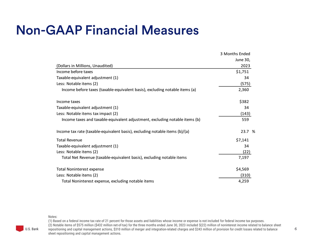Non-GAAP Financial Measures 3 Months Ended June 30, (Dollars in Millions, Unaudited) 2023 Income before taxes $1,751 Taxable-equivalent adjustment (1) 34 Less: Notable items (2) (575) Income before taxes (taxable-equivalent basis), excluding notable items (a) 2,360 Income taxes $382 Taxable-equivalent adjustment (1) 34 Less: Notable items tax impact (2) (143) Income taxes and taxable-equivalent adjustment, excluding notable items (b) 559 Income tax rate (taxable-equivalent basis), excluding notable items (b)/(a) 23.7 % Total Revenue $7,141 Taxable-equivalent adjustment (1) 34 Less: Notable items (2) ( 22) Total Net Revenue (taxable-equivalent basis), excluding notable items 7,197 Total Noninterest expense $4,569 Less: Notable items (2) (310) Total Noninterest expense, excluding notable items 4,259 Notes: (1) Based on a federal income tax rate of 21 percent for those assets and liabilities whose income or expense is not included for federal income tax purposes. (2) Notable items of $575 million ($432 million net-of-tax) for the three months ended June 30, 2023 included $(22) million of noninterest income related to balance sheet 6 U.S. Bank repositioning and capital management actions, $310 million of merger and integration-related charges and $243 million of provision for credit losses related to balance sheet repositioning and capital management actions.