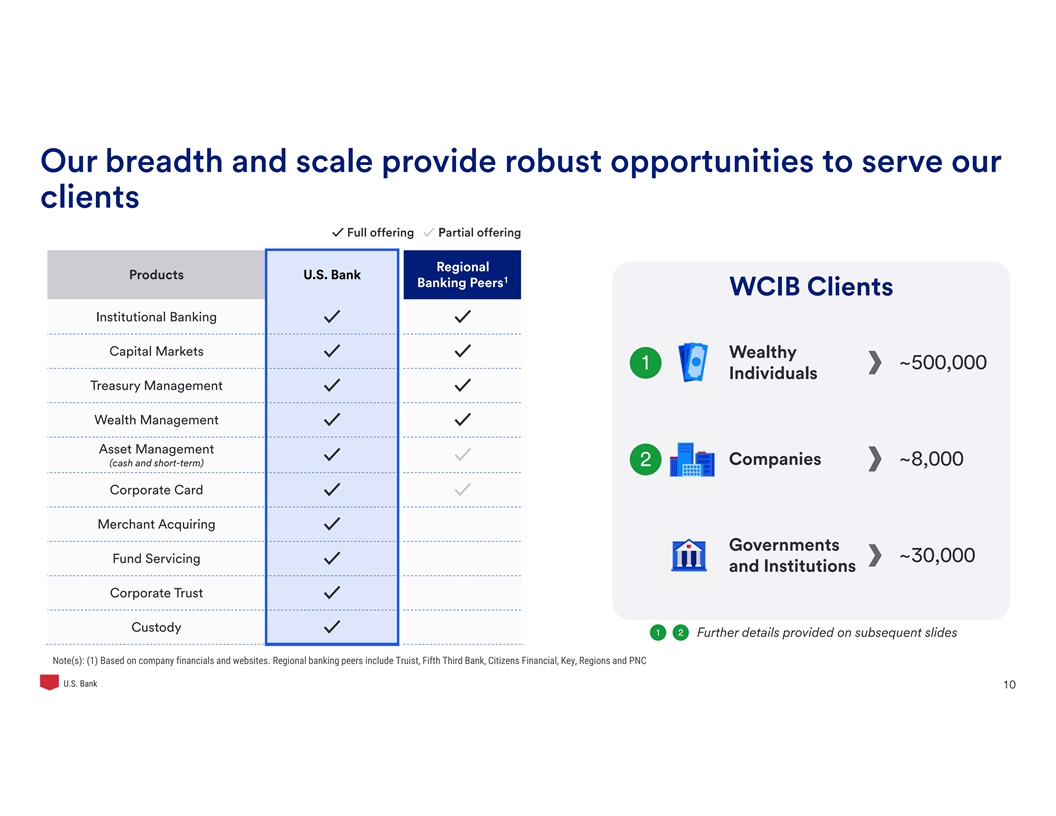 Track record of growth in our businesses 1,2 Average Revenue ($Bn) •• S St tr ro ong, ng, trust truste ed d br brand and WCIB combined 2018-2022 •• B Br road pr oad product oduct se set t CAGR: 6.8% acr acro oss banking and ss banking and 8.3% CAGR WCIB Fee Revenue 5.8% CAGR WCIB Net Interest Income servicing capabilities servicing capabilities $8.7 $7.8 $7.8 •• D Diiv ve er rs sified client ified client $7.2 $7.0 $6.7 segments segments $5.1 $4.7 $4.7 $3.8 $4.3 $4.1 •• S St tr ro ong balance shee ng balance sheet t $3.6 $3.3 $3.1 $3.1 $2.7 •• O Or rg ganic and anic and $2.6 inor inorganic gr ganic gro ow wth th Jan-Sep 2018 2019 2020 2021 2022 Q3 2023 2023 str strat ategies egies Net Interest Income Fee Revenue Net Interest Income Fee Revenue Note(s): (1) Union Bank is included in the business segment numbers as of December 1, 2022; (2) As of 2021, Community Wealth Loans and Deposits have moved from Consumer & Business Banking into WCIB; All periods have been presented on a consistent basis to reflect these changes U.S. Bank 9