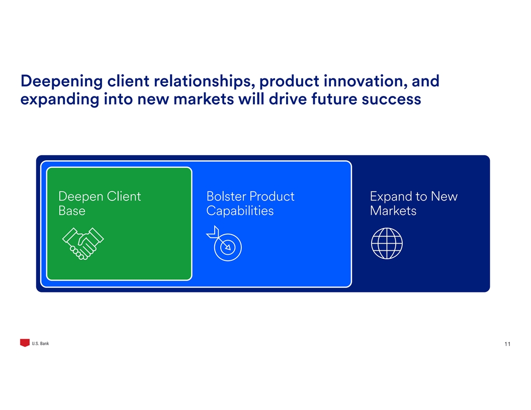 Our breadth and scale provide robust opportunities to serve our clients ✓ Full offering ✓ Partial offering Regional Products U.S. Bank 1 Banking Peers WCIB Clients Institutional Banking ✓ ✓ Capital Markets ✓ ✓ Wealthy 1 1 ~500,000 Individuals Treasury Management ✓ ✓ Wealth Management ✓ ✓ Asset Management ✓ ✓ Companies ~8,000 (cash and short-term) 2 2 Corporate Card ✓ ✓ Merchant Acquiring ✓ Governments Fund Servicing ~30,000 ✓ and Institutions Corporate Trust ✓ Custody ✓ 1 1 2 2 Further details provided on subsequent slides Note(s): (1) Based on company financials and websites. Regional banking peers include Truist, Fifth Third Bank, Citizens Financial, Key, Regions and PNC U.S. Bank 10