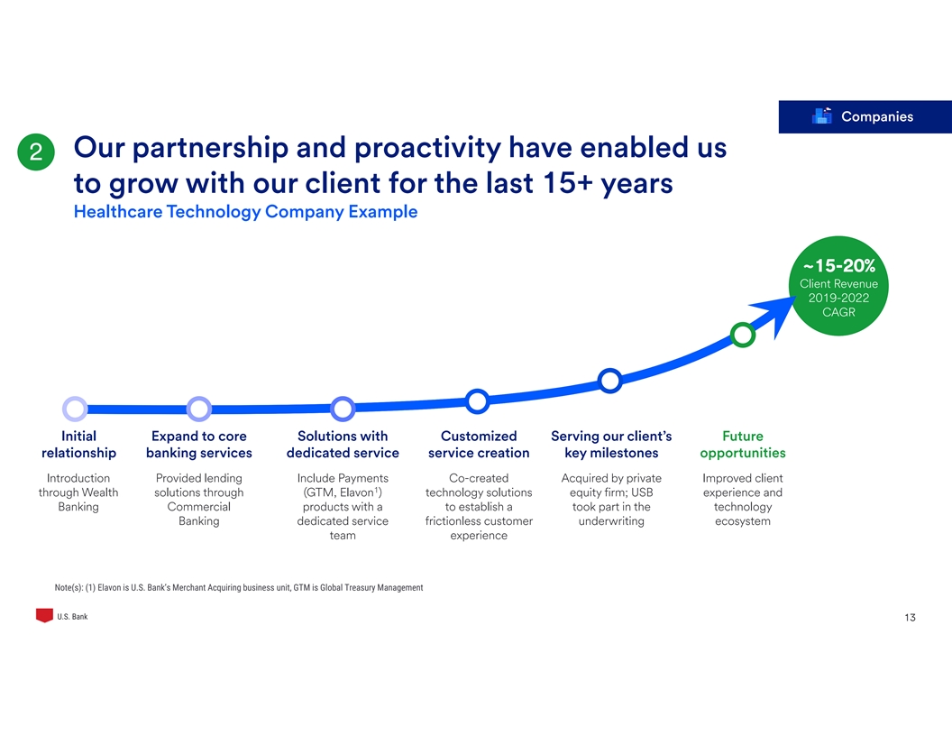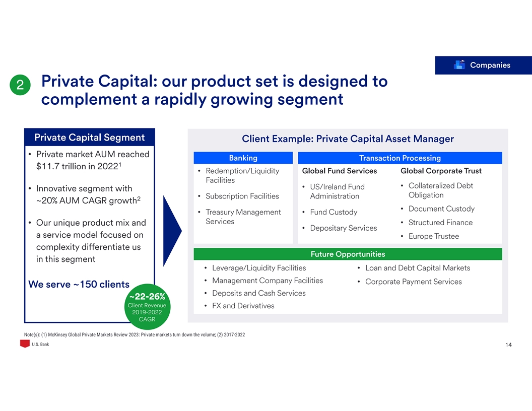 Companies Our partnership and proactivity have enabled us 2 2 to grow with our client for the last 15+ years Healthcare Technology Company Example ~15-20% ~15-20% ~15-20% Client R Client R Client Re e ev v ve e enue nue nue 2019-2022 2019-2022 2019-2022 CA CA CAG G GR R R Initial Expand to core Solutions with Customized Serving our client’s Future relationship banking services dedicated service service creation key milestones opportunities Introduction Provided lending Include Payments Co-created Acquired by private Improved client 1 through Wealth solutions through (GTM, Elavon ) technology solutions equity firm; USB experience and Banking Commercial products with a to establish a took part in the technology Banking dedicated service frictionless customer underwriting ecosystem team experience Note(s): (1) Elavon is U.S. Bank’s Merchant Acquiring business unit, GTM is Global Treasury Management U.S. Bank 13