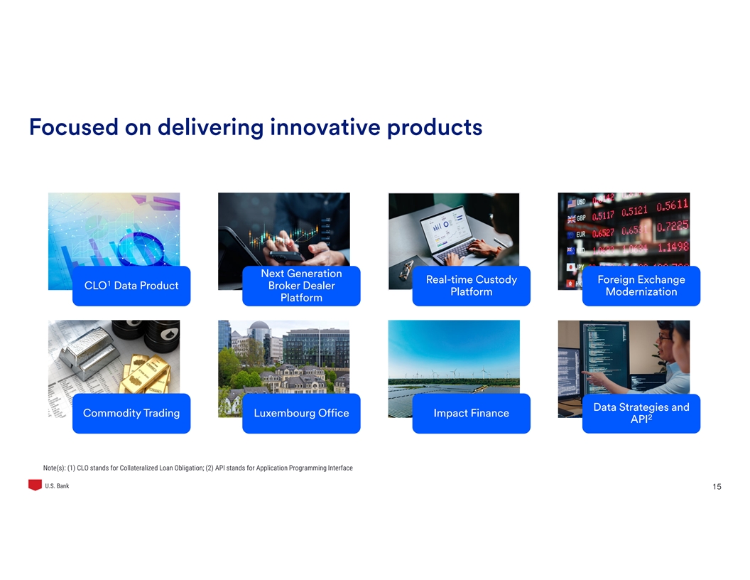Companies Private Capital: our product set is designed to 2 2 complement a rapidly growing segment Private Capital Segment Client E Client Ex xample: P ample: Pr riv ivat ate Capital e Capital A Asset sset M Ma anager nager • Private market AUM reached Banking Transaction Processing 1 $11.7 trillion in 2022 • Redemption/Liquidity Global Fund Services Global Corporate Trust Facilities • Collateralized Debt • US/Ireland Fund • Innovative segment with Obligation • Subscription Facilities Administration 2 ~20% AUM CAGR growth • Document Custody • Treasury Management • Fund Custody Services • Structured Finance • Our unique product mix and • Depositary Services a service model focused on • Europe Trustee complexity differentiate us Future Opportunities in this segment • Leverage/Liquidity Facilities • Loan and Debt Capital Markets • Management Company Facilities • Corporate Payment Services We serve ~150 clients • Deposits and Cash Services ~22-26% Client Revenue • FX and Derivatives 2019-2022 CAGR Note(s): (1) McKinsey Global Private Markets Review 2023: Private markets turn down the volume; (2) 2017-2022 U.S. Bank 14