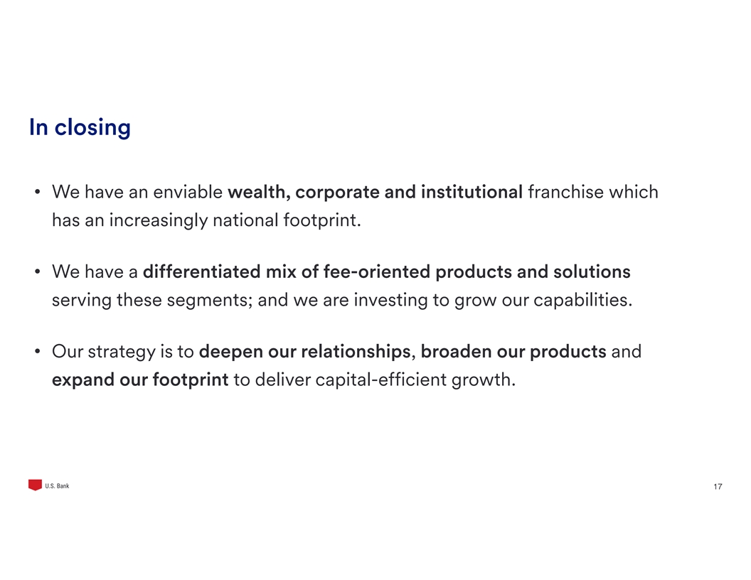 In closing • We have an enviable wealth, corporate and institutional franchise which has an increasingly national footprint. • We have a differentiated mix of fee-oriented products and solutions serving these segments; and we are investing to grow our capabilities. • Our strategy is to deepen our relationships, broaden our products and expand our footprint to deliver capital-efficient growth. U.S. Bank 17