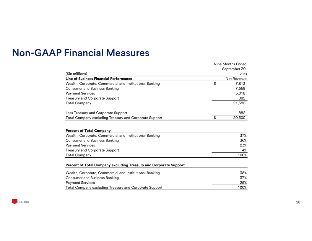 Non-GAAP Financial Measures Nine Months Ended September 30, ($in millions) 2023 Line of Business Financial Performance Net Revenue Wealth, Corporate, Commercial and Institutional Banking $ 7,813 Consumer and Business Banking 7,669 Payment Services 5,018 Treasury and Corporate Support 882 Total Company 21,382 Less Treasury and Corporate Support 882 Total Company excluding Treasury and Corporate Support $ 20,500 Percent of Total Company Wealth, Corporate, Commercial and Institutional Banking 37% Consumer and Business Banking 36% Payment Services 23% Treasury and Corporate Support 4% Total Company 100% Percent of Total Company excluding Treasury and Corporate Support Wealth, Corporate, Commercial and Institutional Banking 38% Consumer and Business Banking 37% Payment Services 25% Total Company excluding Treasury and Corporate Support 100% U.S. Bank 20