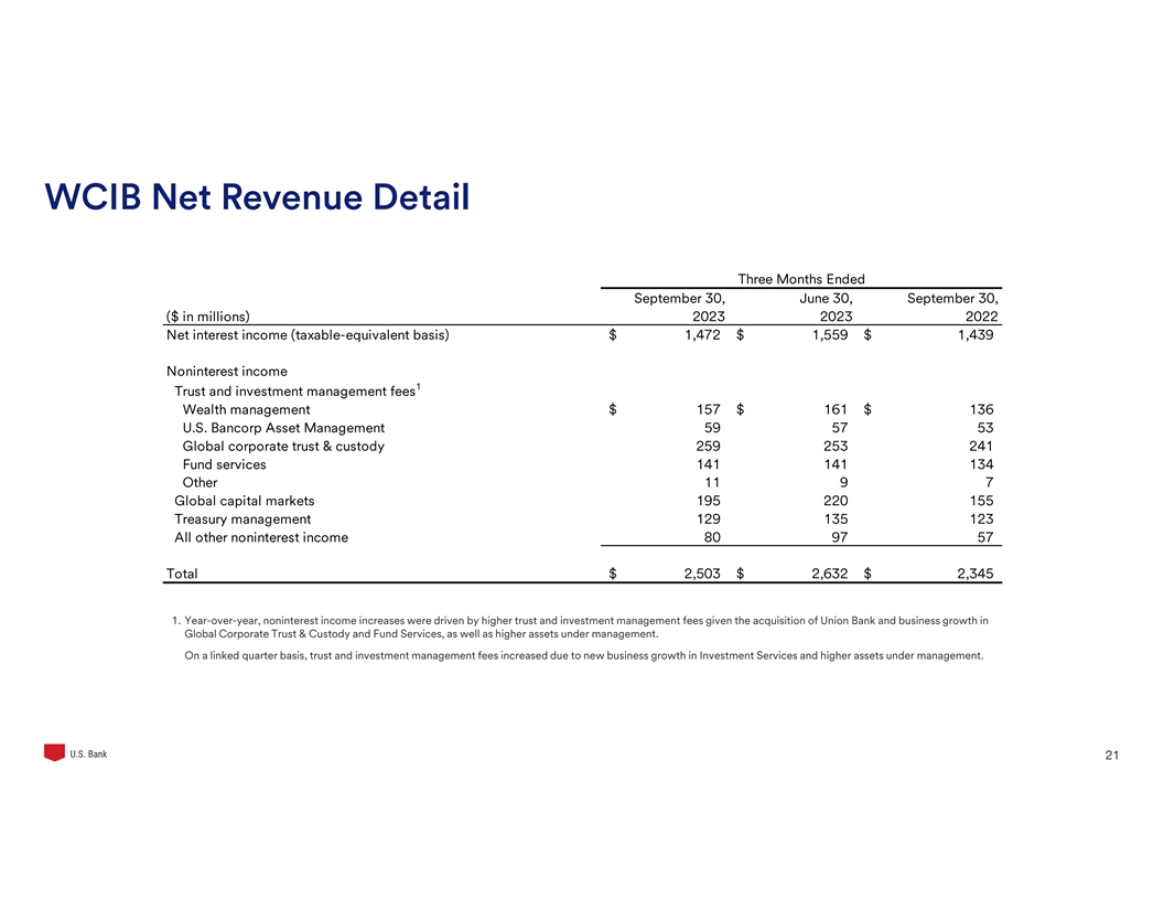 WCIB Net Revenue Detail Three Months Ended September 30, June 30, September 30, ($ in millions) 2023 2023 2022 Net interest income (taxable-equivalent basis) $ 1,472 $ 1,559 $ 1,439 Noninterest income 1 Trust and investment management fees Wealth management $ 157 $ 161 $ 136 U.S. Bancorp Asset Management 59 57 53 Global corporate trust & custody 2 59 253 241 Fund services 1 41 141 1 34 Other 11 9 7 Global capital markets 1 95 220 155 Treasury management 1 29 135 1 23 All other noninterest income 80 97 57 Total $ 2,503 $ 2,632 $ 2,345 1. Year-over-year, noninterest income increases were driven by higher trust and investment management fees given the acquisition of Union Bank and business growth in Global Corporate Trust & Custody and Fund Services, as well as higher assets under management. On a linked quarter basis, trust and investment management fees increased due to new business growth in Investment Services and higher assets under management. U.S. Bank 21