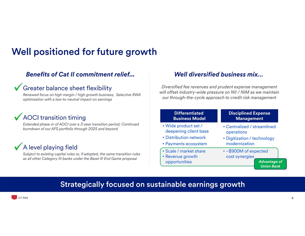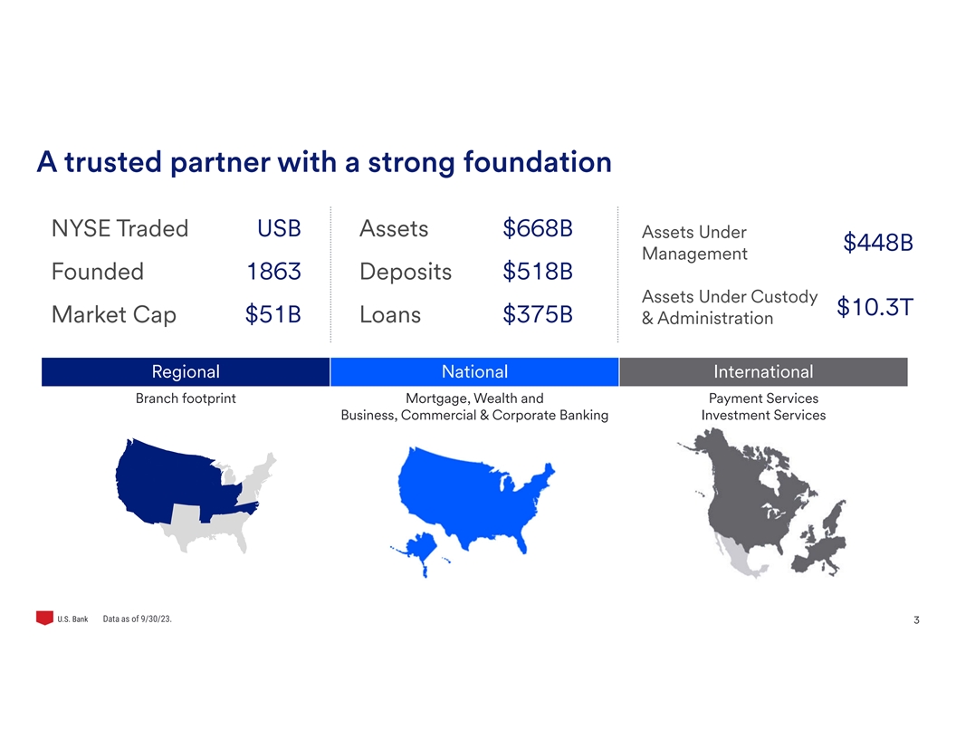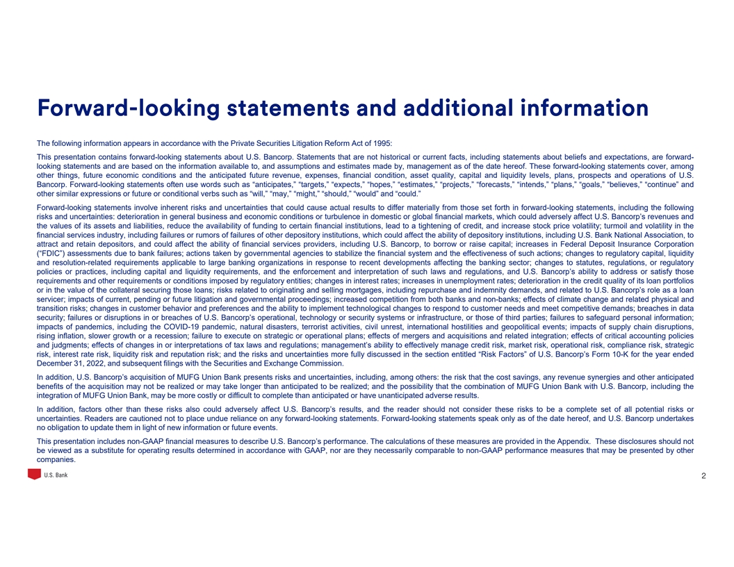 Forward-looking statements and additional information Thefollowinginformationappearsin accordancewith thePrivateSecuritiesLitigationReformAct of1995: This presentation contains forward-looking statements about U.S. Bancorp. Statements that are not historical or current facts, including statements about beliefs and expectations, are forward- looking statements and are based on the information available to, and assumptions and estimates made by, management as of the date hereof. These forward-looking statements cover, among other things, future economic conditions and the anticipated future revenue, expenses, financial condition, asset quality, capital and liquidity levels, plans, prospects and operations of U.S. Bancorp. Forward-looking statements often use words such as “anticipates,” “targets,” “expects,” “hopes,” “estimates,” “projects,” “forecasts,” “intends,” “plans,” “goals,” “believes,” “continue” and othersimilar expressionsor futureor conditionalverbssuchas “will,” “may,” “might,”“should,”“would”and“could.” Forward-looking statements involve inherent risks and uncertainties that could cause actual results to differ materially from those set forth in forward-looking statements, including the following risks and uncertainties: deterioration in general business and economic conditions or turbulence in domestic or global financial markets, which could adversely affect U.S. Bancorp’s revenues and the values of its assets and liabilities, reduce the availability of funding to certain financial institutions, lead to a tightening of credit, and increase stock price volatility; turmoil and volatility in the financial services industry, including failures or rumors of failures of other depository institutions, which could affect the ability of depository institutions, including U.S. Bank National Association, to attract and retain depositors, and could affect the ability of financial services providers, including U.S. Bancorp, to borrow or raise capital; increases in Federal Deposit Insurance Corporation (“FDIC”) assessments due to bank failures; actions taken by governmental agencies to stabilize the financial system and the effectiveness of such actions; changes to regulatory capital, liquidity and resolution-related requirements applicable to large banking organizations in response to recent developments affecting the banking sector; changes to statutes, regulations, or regulatory policies or practices, including capital and liquidity requirements, and the enforcement and interpretation of such laws and regulations, and U.S. Bancorp’s ability to address or satisfy those requirements and other requirements or conditions imposed by regulatory entities; changes in interest rates; increases in unemployment rates; deterioration in the credit quality of its loan portfolios or in the value of the collateral securing those loans; risks related to originating and selling mortgages, including repurchase and indemnity demands, and related to U.S. Bancorp’s role as a loan servicer; impacts of current, pending or future litigation and governmental proceedings; increased competition from both banks and non-banks; effects of climate change and related physical and transition risks; changes in customer behavior and preferences and the ability to implement technological changes to respond to customer needs and meet competitive demands; breaches in data security; failures or disruptions in or breaches of U.S. Bancorp’s operational, technology or security systems or infrastructure, or those of third parties; failures to safeguard personal information; impacts of pandemics, including the COVID-19 pandemic, natural disasters, terrorist activities, civil unrest, international hostilities and geopolitical events; impacts of supply chain disruptions, rising inflation, slower growth or a recession; failure to execute on strategic or operational plans; effects of mergers and acquisitions and related integration; effects of critical accounting policies and judgments; effects of changes in or interpretations of tax laws and regulations; management’s ability to effectively manage credit risk, market risk, operational risk, compliance risk, strategic risk, interest rate risk, liquidity risk and reputation risk; and the risks and uncertainties more fully discussed in the section entitled “Risk Factors” of U.S. Bancorp’s Form 10-K for the year ended December31,2022,andsubsequentfilingswith theSecuritiesandExchangeCommission. In addition, U.S. Bancorp’s acquisition of MUFG Union Bank presents risks and uncertainties, including, among others: the risk that the cost savings, any revenue synergies and other anticipated benefits of the acquisition may not be realized or may take longer than anticipated to be realized; and the possibility that the combination of MUFG Union Bank with U.S. Bancorp, including the integrationof MUFG UnionBank,may bemorecostly or difficultto completethananticipatedor haveunanticipatedadverseresults. In addition, factors other than these risks also could adversely affect U.S. Bancorp’s results, and the reader should not consider these risks to be a complete set of all potential risks or uncertainties. Readers are cautioned not to place undue reliance on any forward-looking statements. Forward-looking statements speak only as of the date hereof, and U.S. Bancorp undertakes noobligationto updatethemin lightof newinformationor futureevents. This presentation includes non-GAAP financial measures to describe U.S. Bancorp’s performance. The calculations of these measures are provided in the Appendix. These disclosures should not be viewed as a substitute for operating results determined in accordance with GAAP, nor are they necessarily comparable to non-GAAP performance measures that may be presented by other companies. U.S. Bank 2