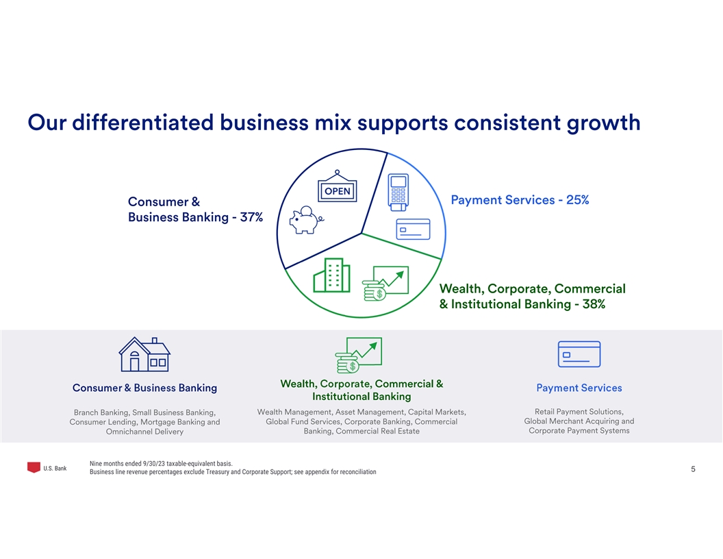 Well positioned for future growth Benefits of Cat II commitment relief... Well diversified business mix… Diversified fee revenues and prudent expense management Greater balance sheet flexibility ü will offset industry-wide pressure on NII / NIM as we maintain Renewed focus on high margin / high growth business; Selective RWA our through-the-cycle approach to credit risk management optimization with a low-to-neutral impact on earnings Differentiated Disciplined Expense AOCI transition timing Business Model Management ü Extended phase-in of AOCI over a 3-year transition period; Continued • Wide product set / • Centralized / streamlined burndown of our AFS portfolio through 2025 and beyond deepening client base operations • Distribution network • Digitization / technology • Payments ecosystem modernization A level playing field ü • Scale / market share • ~$900M of expected Subject to existing capital rules or, if adopted, the same transition rules • Revenue growth cost synergies as all other Category III banks under the Basel III End Game proposal Advantage of opportunities Union Bank Strategically focused on sustainable earnings growth U.S. Bank 4