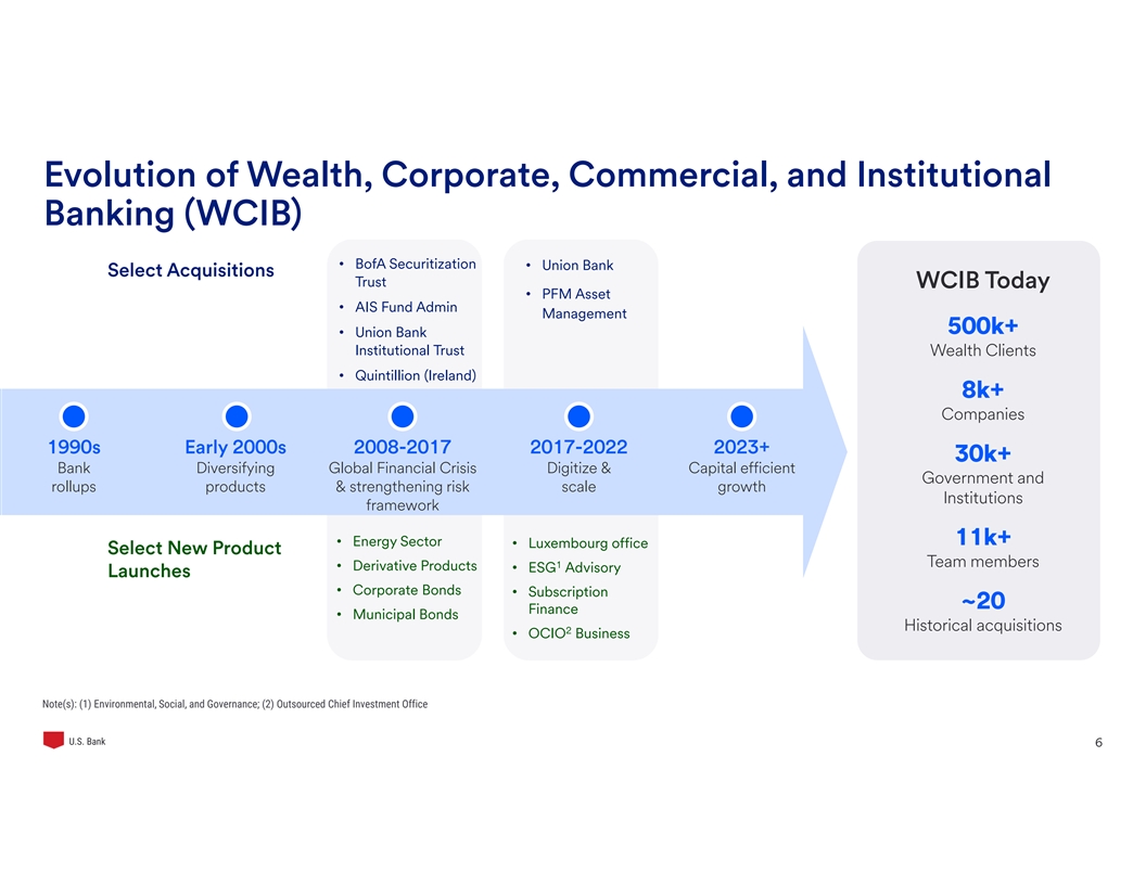 Our differentiated business mix supports consistent growth Payment Services - 25% Consumer & Business Banking - 37% Wealth, Corporate, Commercial & Institutional Banking - 38% Wealth, Corporate, Commercial & Consumer & Business Banking Payment Services Institutional Banking Wealth Management, Asset Management, Capital Markets, Retail Payment Solutions, Branch Banking, Small Business Banking, Global Merchant Acquiring and Consumer Lending, Mortgage Banking and Global Fund Services, Corporate Banking, Commercial Banking, Commercial Real Estate Corporate Payment Systems Omnichannel Delivery Nine months ended 9/30/23 taxable-equivalent basis. U.S. Bank 5 Business line revenue percentages exclude Treasury and Corporate Support; see appendix for reconciliation
