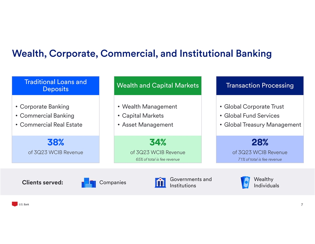 Evolution of Wealth, Corporate, Commercial, and Institutional Banking (WCIB) • BofA Securitization • Union Bank Select Acquisitions Trust W WC CIB T IB To oda day y • PFM Asset • AIS Fund Admin Management 500k+ 500k+ • Union Bank Institutional Trust W We ealth Clients alth Clients • Quintillion (Ireland) 8k+ 8k+ Companies Companies 1990s Early 2000s 2008-2017 2017-2022 2023+ 30k+ 30k+ Bank Diversifying Global Financial Crisis Digitize & Capital efficient Go Gov ve ernme rnmen nt t and and rollups products & strengthening risk scale growth I In nstitutions stitutions framework 11k+ 11k+ • Energy Sector • Luxembourg office Select New Product T Te eam members am members 1 • Derivative Products • ESG Advisory Launches • Corporate Bonds • Subscription ~20 ~20 Finance • Municipal Bonds H Hiist storical acquisitions orical acquisitions 2 • OCIO Business Note(s): (1) Environmental, Social, and Governance; (2) Outsourced Chief Investment Office U.S. Bank 6