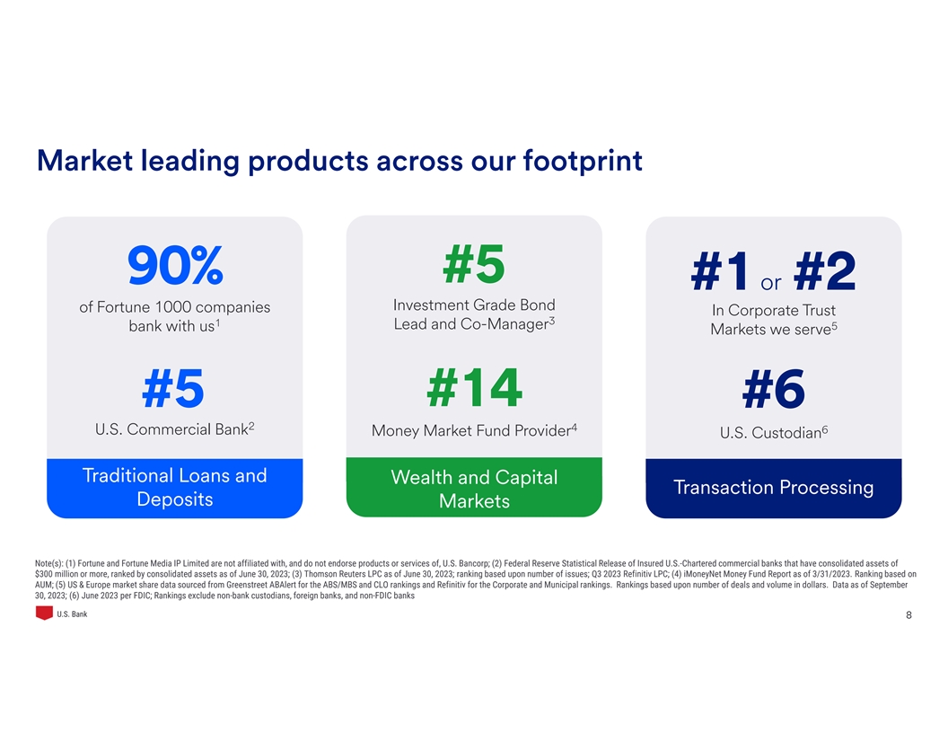 Wealth, Corporate, Commercial, and Institutional Banking Traditional Loans and Wealth and Capital Markets Transaction Processing Deposits • Corporate Banking • Wealth Management • Global Corporate Trust • Commercial Banking • Capital Markets • Global Fund Services • Commercial Real Estate • Asset Management • Global Treasury Management 38% 34% 28% of 3Q23 WCIB Revenue of 3Q23 WCIB Revenue of 3Q23 WCIB Revenue 0% of total is fee revenue 65% of total is fee revenue 71% of total is fee revenue Governments and Wealthy Companies Clients served: Institutions Individuals U.S. Bank 7