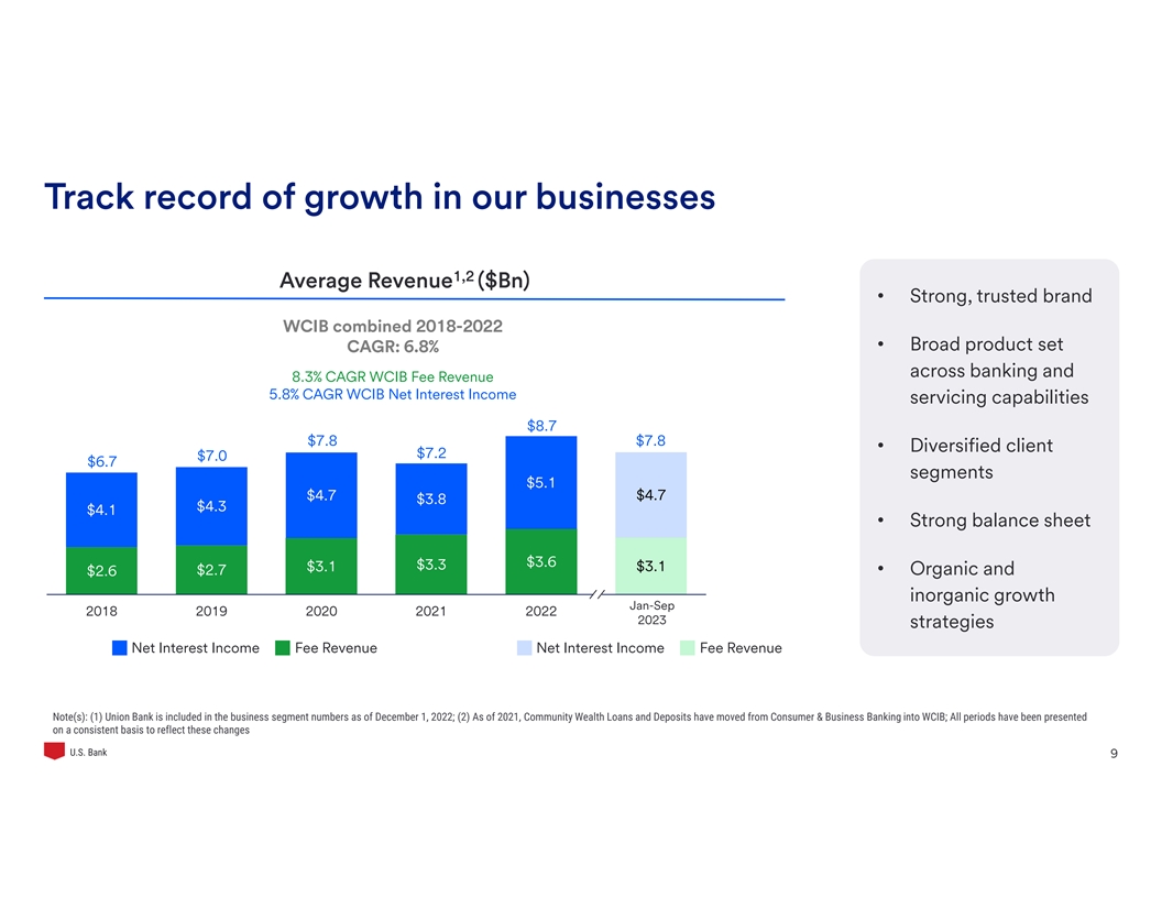 Market leading products across our footprint #5 90% #1 or #2 Investment Grade Bond of Fortune 1000 companies In Corporate Trust 3 1 Lead and Co-Manager 5 bank with us Markets we serve #14 #5 #6 2 4 6 U.S. Commercial Bank Money Market Fund Provider U.S. Custodian Traditional Loans and Wealth and Capital Transaction Processing Deposits Markets Note(s): (1) Fortune and Fortune Media IP Limited are not affiliated with, and do not endorse products or services of, U.S. Bancorp; (2) Federal Reserve Statistical Release of Insured U.S.-Chartered commercial banks that have consolidated assets of $300 million or more, ranked by consolidated assets as of June 30, 2023; (3) Thomson Reuters LPC as of June 30, 2023; ranking based upon number of issues; Q3 2023 Refinitiv LPC; (4) iMoneyNet Money Fund Report as of 3/31/2023. Ranking based on AUM; (5) US & Europe market share data sourced from Greenstreet ABAlert for the ABS/MBS and CLO rankings and Refinitiv for the Corporate and Municipal rankings. Rankings based upon number of deals and volume in dollars. Data as of September 30, 2023; (6) June 2023 per FDIC; Rankings exclude non-bank custodians, foreign banks, and non-FDIC banks U.S. Bank 8