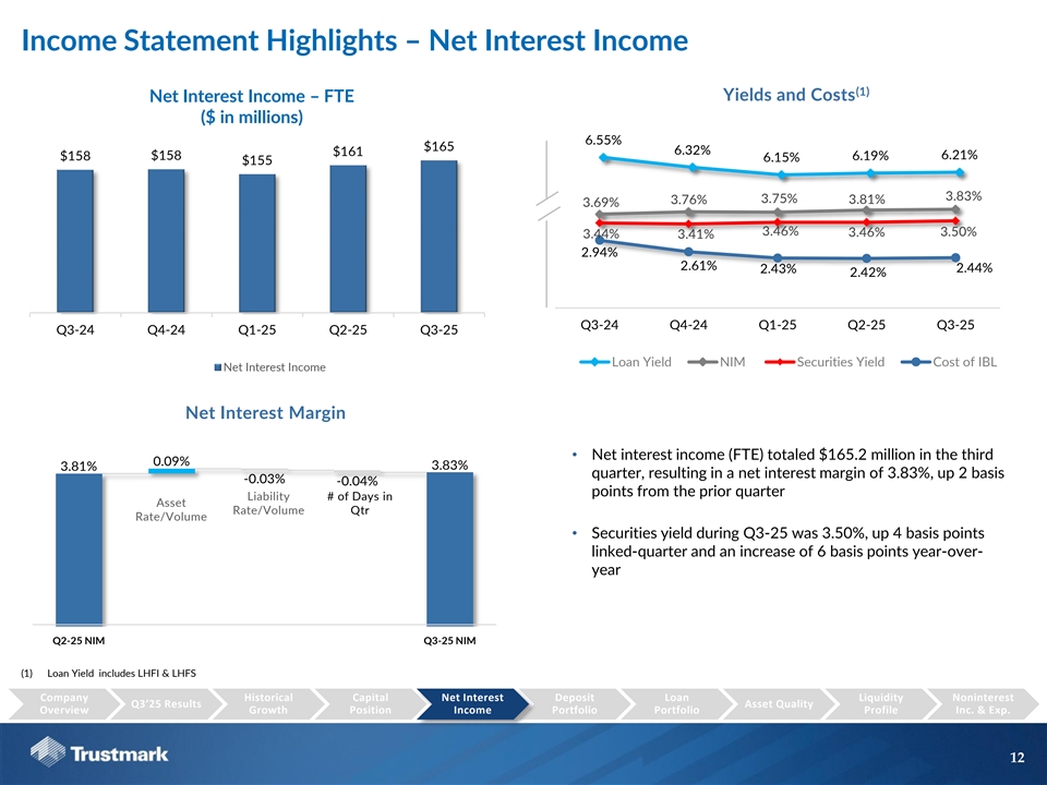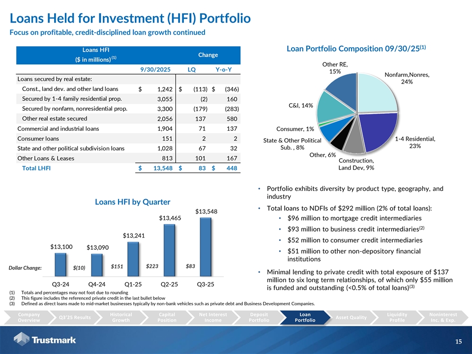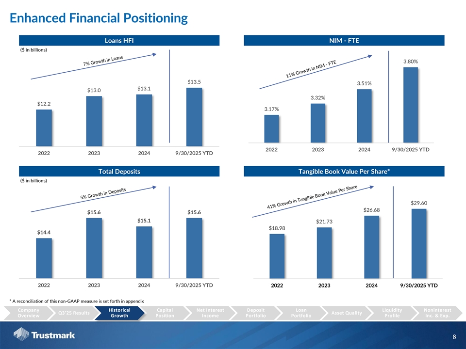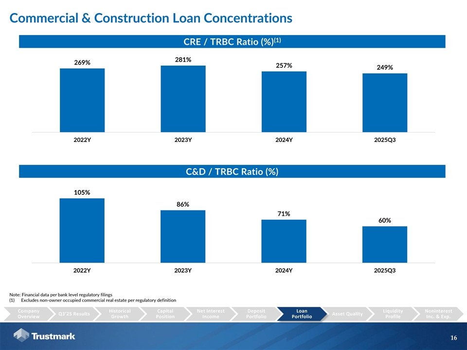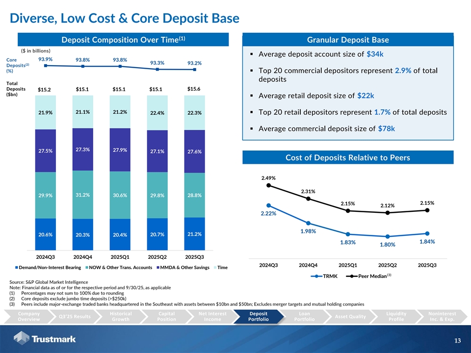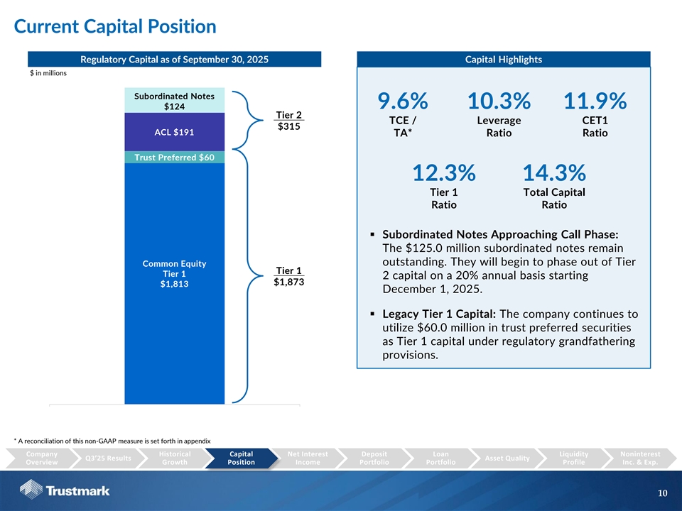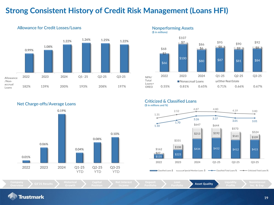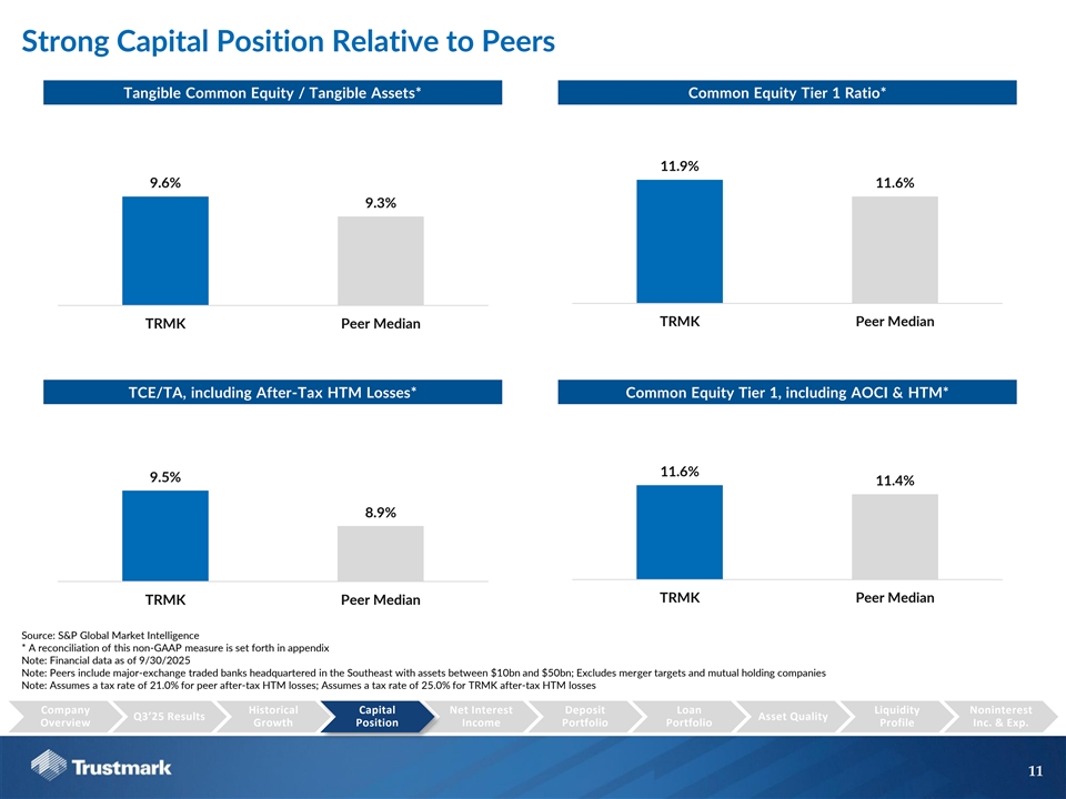 Strong Capital Position Relative to Peers Tangible Common Equity / Tangible Assets* Common Equity Tier 1 Ratio* 11.9% 9.6% 11.6% 9.3% TRMK Peer Median TRMK Peer Median TCE/TA, including After-Tax HTM Losses* Common Equity Tier 1, including AOCI & HTM* 11.6% 9.5% 11.4% 8.9% TRMK Peer Median TRMK Peer Median Source: S&P Global Market Intelligence * A reconciliation of this non-GAAP measure is set forth in appendix Note: Financial data as of 9/30/2025 Note: Peers include major-exchange traded banks headquartered in the Southeast with assets between $10bn and $50bn; Excludes merger targets and mutual holding companies Note: Assumes a tax rate of 21.0% for peer after-tax HTM losses; Assumes a tax rate of 25.0% for TRMK after-tax HTM losses Company Historical C Ca ap pi it ta al l Net Interest Deposit Loan Liquidity Noninterest Q3’25 Results Asset Quality Overview Growth P Po os si it ti io on n Income Portfolio Portfolio Profile Inc. & Exp. 11