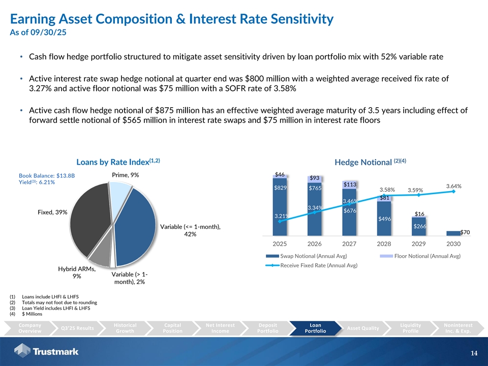 Diverse, Low Cost & Core Deposit Base (1) Deposit Composition Over Time Granular Deposit Base ($ in billions) ▪ Average deposit account size of $34k 93.9% Core 93.8% 93.8% 93.3% 93.2% (2) Deposits (%) ▪ Top 20 commercial depositors represent 2.9% of total deposits Total Deposits $15.6 $15.2 $15.1 $15.1 $15.1 ($bn) ▪ Average retail deposit size of $22k 21.1% 21.2% 21.9% 22.4% 22.3% ▪ Top 20 retail depositors represent 1.7% of total deposits ▪ Average commercial deposit size of $78k 27.3% 27.9% 27.5% 27.1% 27.6% Cost of Deposits Relative to Peers 2.49% 2.31% 31.2% 29.9% 30.6% 29.8% 28.8% 2.15% 2.15% 2.12% 2.22% 1.98% 21.2% 20.6% 20.3% 20.4% 20.7% 1.84% 1.83% 1.80% 2024Q3 2024Q4 2025Q1 2025Q2 2025Q3 2024Q3 2024Q4 2025Q1 2025Q2 2025Q3 Demand/Non-Interest Bearing NOW & Other Trans. Accounts MMDA & Other Savings Time (3) TRMK Peer Median Source: S&P Global Market Intelligence Note: Financial data as of or for the respective period and 9/30/25, as applicable (1) Percentages may not sum to 100% due to rounding (2) Core deposits exclude jumbo time deposits (>$250k) (3) Peers include major-exchange traded banks headquartered in the Southeast with assets between $10bn and $50bn; Excludes merger targets and mutual holding companies Company Historical Capital Net Interest D De ep po os si it t Loan Liquidity Noninterest Q3’25 Results Asset Quality Overview Growth Position Income P Po or rt tf fo ol li io o Portfolio Profile Inc. & Exp. 13