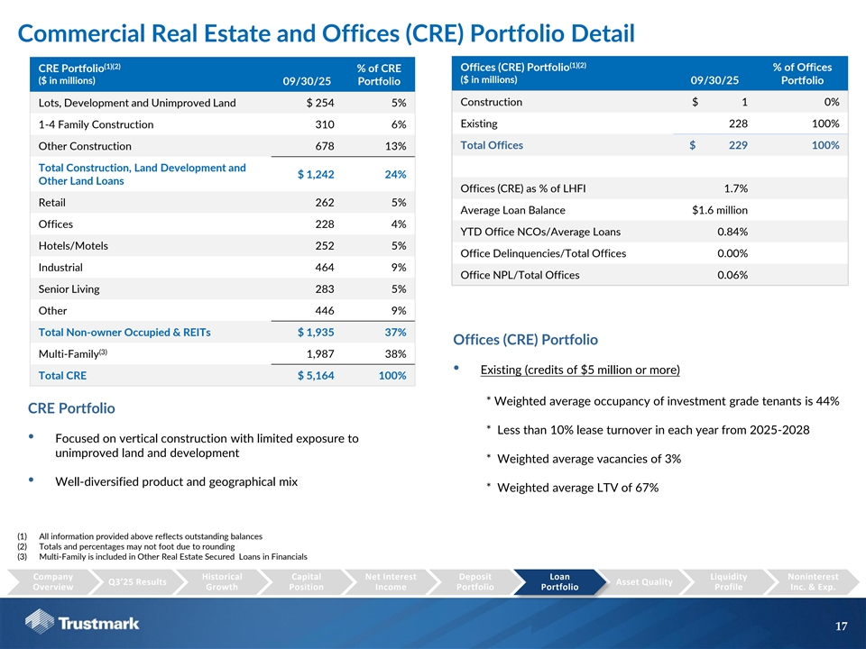Commercial & Construction Loan Concentrations (1) CRE / TRBC Ratio (%) 281% 269% 257% 249% 2022Y 2023Y 2024Y 2025Q3 C&D / TRBC Ratio (%) 105% 86% 71% 60% 2022Y 2023Y 2024Y 2025Q3 Note: Financial data per bank level regulatory filings (1) Excludes non-owner occupied commercial real estate per regulatory definition Company Historical Capital Net Interest Deposit L Lo oa an n Liquidity Noninterest Q3’25 Results Asset Quality Overview Growth Position Income Portfolio P Po or rt tf fo ol li io o Profile Inc. & Exp. 16