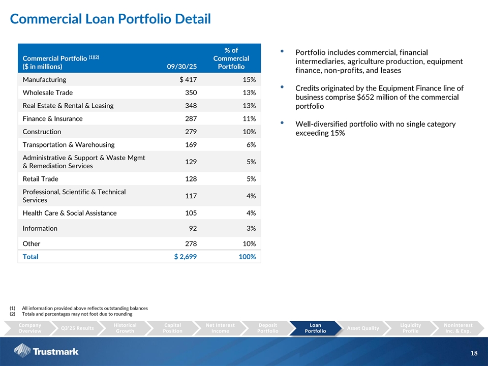 Commercial Real Estate and Offices (CRE) Portfolio Detail (1)(2) (1)(2) Offices (CRE) Portfolio % of Offices CRE Portfolio % of CRE ($ in millions) ($ in millions) 09/30/25 Portfolio 09/30/25 Portfolio Construction $ 1 0% Lots, Development and Unimproved Land $ 254 5% Existing 228 100% 1-4 Family Construction 310 6% Total Offices $ 229 100% Other Construction 678 13% Total Construction, Land Development and $ 1,242 24% Other Land Loans Offices (CRE) as % of LHFI 1.7% Retail 262 5% Average Loan Balance $1.6 million Offices 228 4% YTD Office NCOs/Average Loans 0.84% Hotels/Motels 252 5% Office Delinquencies/Total Offices 0.00% Industrial 464 9% Office NPL/Total Offices 0.06% Senior Living 283 5% Other 446 9% Total Non-owner Occupied & REITs $ 1,935 37% Offices (CRE) Portfolio (3) Multi-Family 1,987 38% • Existing (credits of $5 million or more) Total CRE $ 5,164 100% * Weighted average occupancy of investment grade tenants is 44% CRE Portfolio * Less than 10% lease turnover in each year from 2025-2028 • Focused on vertical construction with limited exposure to unimproved land and development * Weighted average vacancies of 3% • Well-diversified product and geographical mix * Weighted average LTV of 67% (1) All information provided above reflects outstanding balances (2) Totals and percentages may not foot due to rounding (3) Multi-Family is included in Other Real Estate Secured Loans in Financials Company Historical Capital Net Interest Deposit L Lo oa an n Liquidity Noninterest Q3’25 Results Asset Quality Overview Growth Position Income Portfolio P Po or rt tf fo ol li io o Profile Inc. & Exp. 17