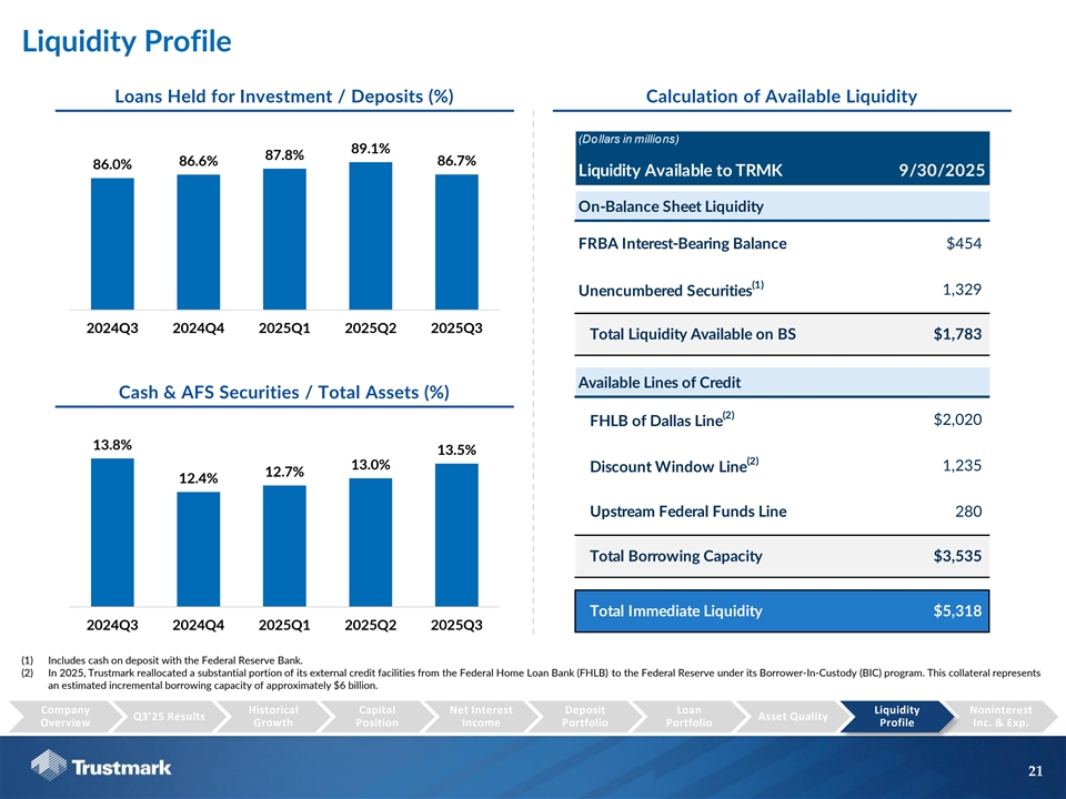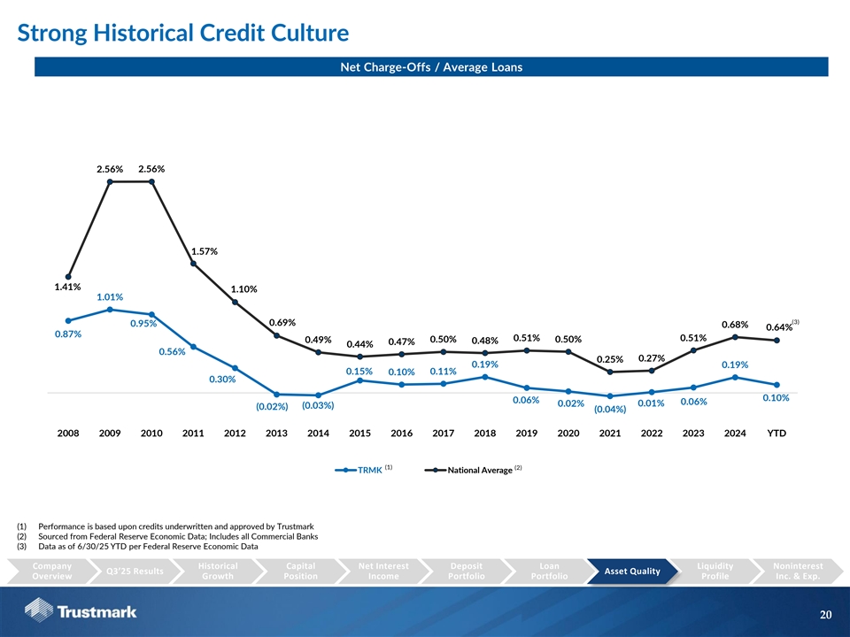 Strong Historical Credit Culture Net Charge-Offs / Average Loans 2.56% 2.56% 1.57% 1.41% 1.10% 1.01% (3) 0.69% 0.95% 0.68% 0.64% 0.87% 0.51% 0.51% 0.49% 0.50% 0.50% 0.48% 0.47% 0.44% 0.56% 0.27% 0.25% 0.19% 0.19% 0.15% 0.10% 0.11% 0.30% 0.10% 0.06% 0.06% 0.02% 0.01% (0.03%) (0.02%) (0.04%) 2008 2009 2010 2011 2012 2013 2014 2015 2016 2017 2018 2019 2020 2021 2022 2023 2024 YTD (1) (2) TRMK National Average (1) Performance is based upon credits underwritten and approved by Trustmark (2) Sourced from Federal Reserve Economic Data; Includes all Commercial Banks (3) Data as of 6/30/25 YTD per Federal Reserve Economic Data Company Historical Capital Net Interest Deposit Loan Liquidity Noninterest Q3’25 Results A As ss se et t Q Qu ua al li it ty y Overview Growth Position Income Portfolio Portfolio Profile Inc. & Exp. 20