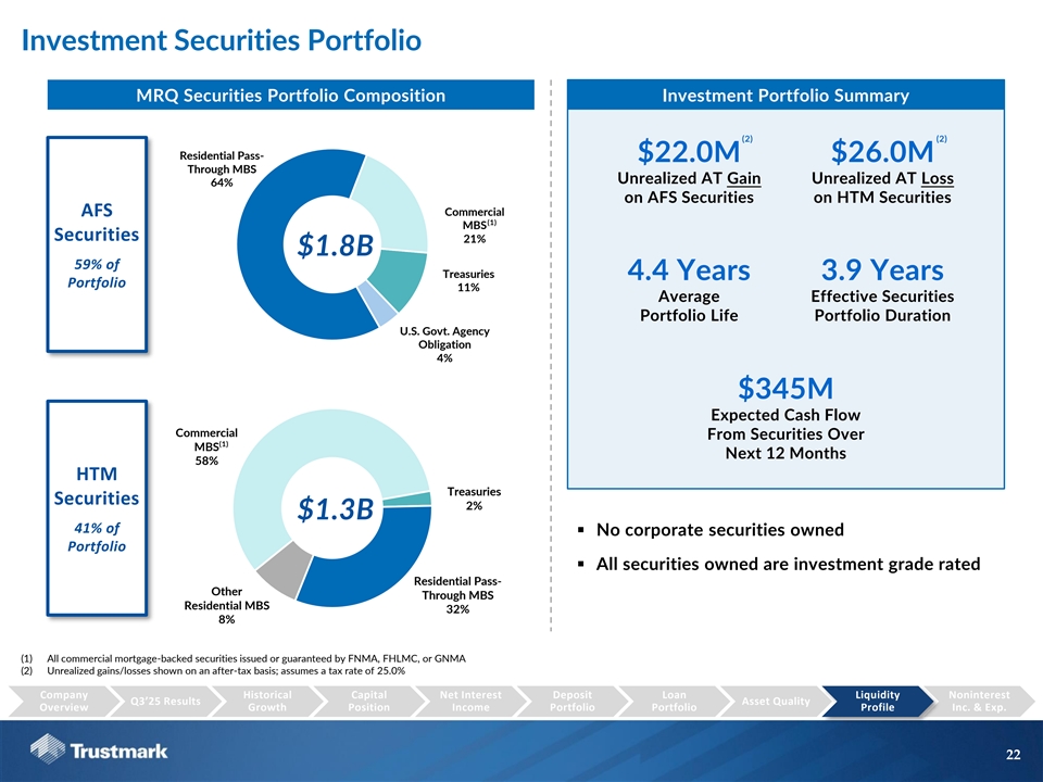 Liquidity Profile Loans Held for Investment / Deposits (%) Calculation of Available Liquidity (Dollars in millions) 89.1% 87.8% 86.6% 86.7% 86.0% Liquidity Available to TRMK 9/30/2025 On-Balance Sheet Liquidity FRBA Interest-Bearing Balance $454 (1) 1,329 Unencumbered Securities 2024Q3 2024Q4 2025Q1 2025Q2 2025Q3 Total Liquidity Available on BS $1,783 Available Lines of Credit Cash & AFS Securities / Total Assets (%) (2) $2,020 FHLB of Dallas Line 13.8% 13.5% (2) 13.0% 1,235 Discount Window Line 12.7% 12.4% Upstream Federal Funds Line 280 Total Borrowing Capacity $3,535 Total Immediate Liquidity $5,318 2024Q3 2024Q4 2025Q1 2025Q2 2025Q3 (1) Includes cash on deposit with the Federal Reserve Bank. (2) In 2025, Trustmark reallocated a substantial portion of its external credit facilities from the Federal Home Loan Bank (FHLB) to the Federal Reserve under its Borrower-In-Custody (BIC) program. This collateral represents an estimated incremental borrowing capacity of approximately $6 billion. Company Historical Capital Net Interest Deposit Loan L Li iq qu ui id di it ty y Noninterest Q3’25 Results Asset Quality Overview Growth Position Income Portfolio Portfolio P Pr ro of fi il le e Inc. & Exp. 21