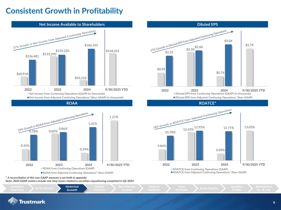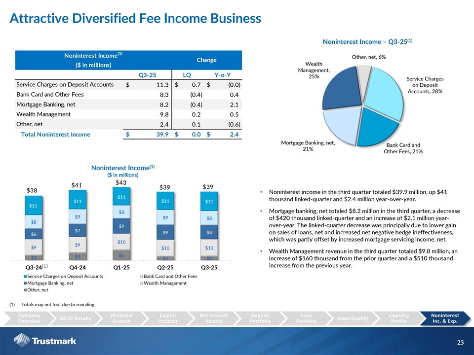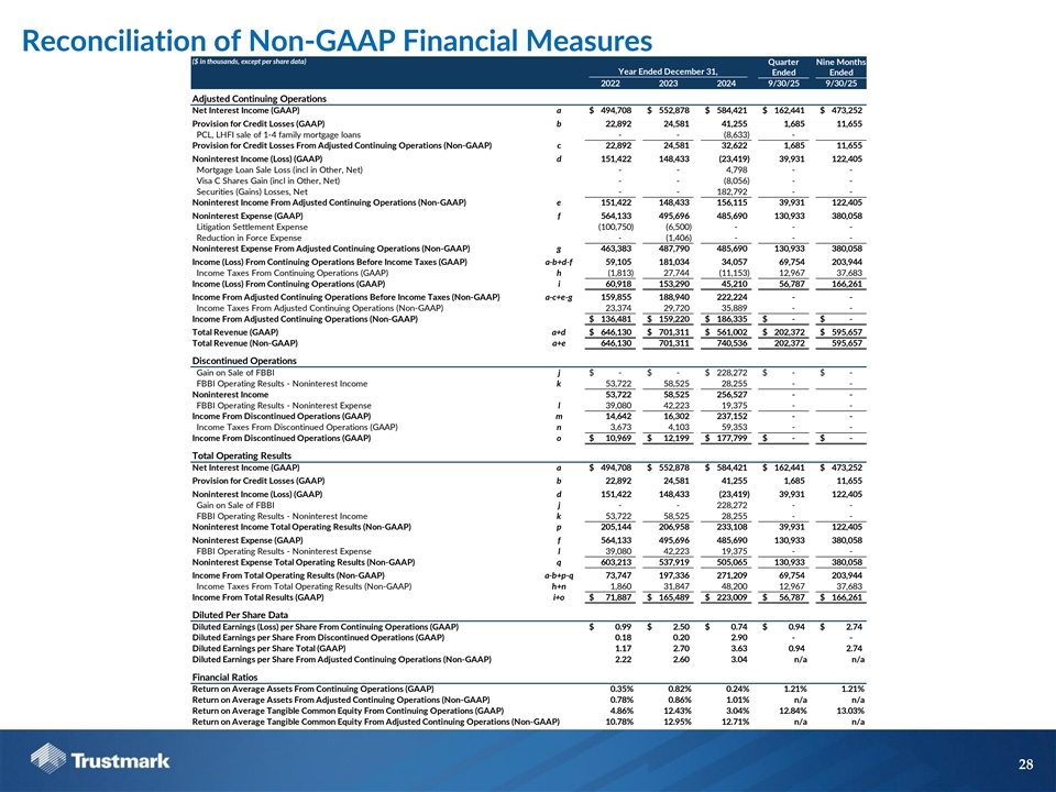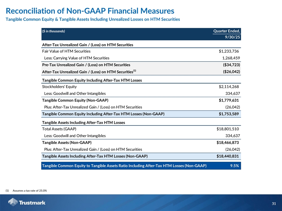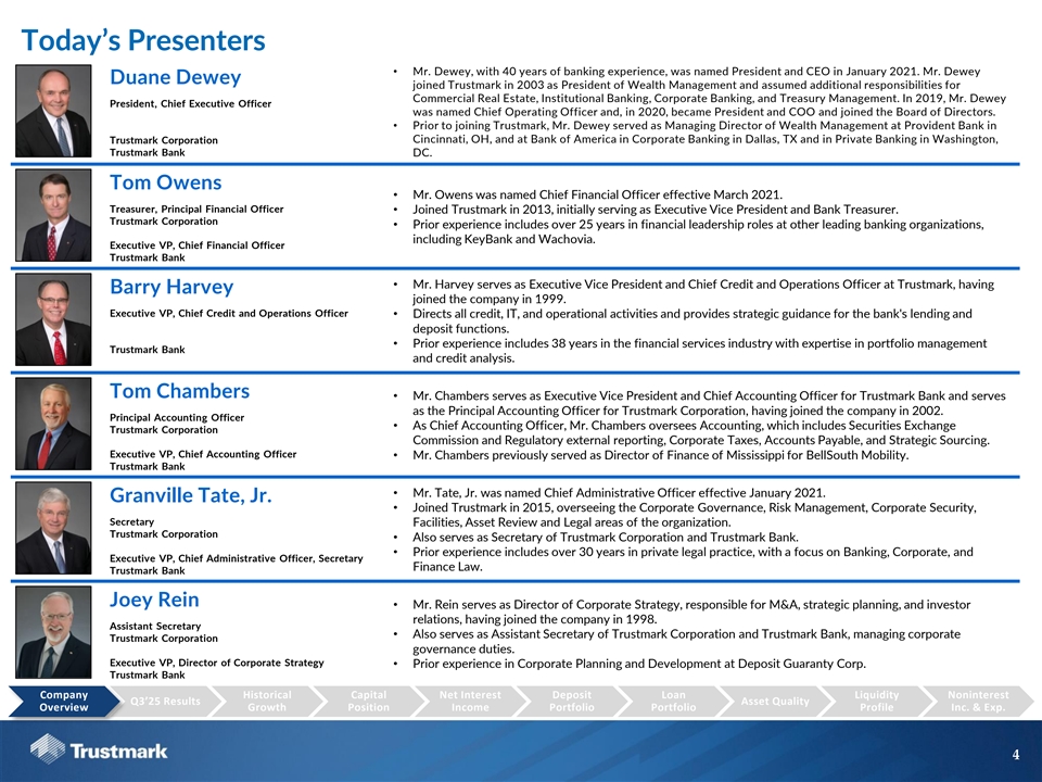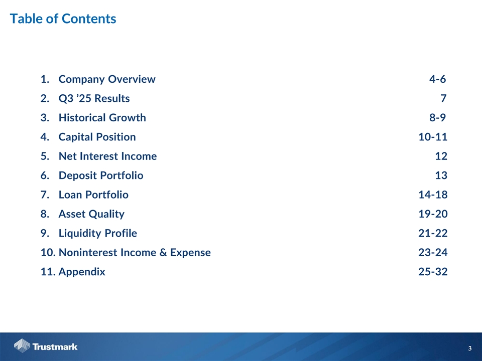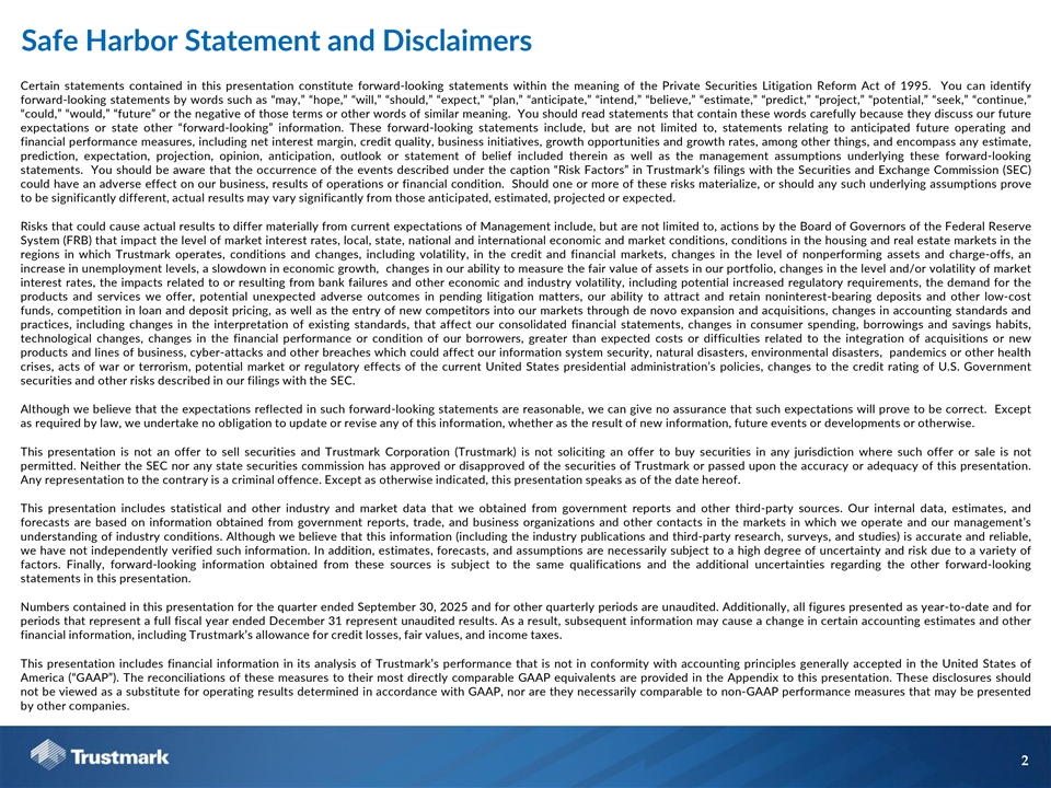 Safe Harbor Statement and Disclaimers Certain statements contained in this presentation constitute forward-looking statements within the meaning of the Private Securities Litigation Reform Act of 1995. You can identify forward-looking statements by words such as “may,” “hope,” “will,” “should,” “expect,” “plan,” “anticipate,” “intend,” “believe,” “estimate,” “predict,” “project,” “potential,” “seek,” “continue,” “could,” “would,” “future” or the negative of those terms or other words of similar meaning. You should read statements that contain these words carefully because they discuss our future expectations or state other “forward-looking” information. These forward-looking statements include, but are not limited to, statements relating to anticipated future operating and financial performance measures, including net interest margin, credit quality, business initiatives, growth opportunities and growth rates, among other things, and encompass any estimate, prediction, expectation, projection, opinion, anticipation, outlook or statement of belief included therein as well as the management assumptions underlying these forward-looking statements. You should be aware that the occurrence of the events described under the caption “Risk Factors” in Trustmark’s filings with the Securities and Exchange Commission (SEC) could have an adverse effect on our business, results of operations or financial condition. Should one or more of these risks materialize, or should any such underlying assumptions prove to be significantly different, actual results may vary significantly from those anticipated, estimated, projected or expected. Risks that could cause actual results to differ materially from current expectations of Management include, but are not limited to, actions by the Board of Governors of the Federal Reserve System (FRB) that impact the level of market interest rates, local, state, national and international economic and market conditions, conditions in the housing and real estate markets in the regions in which Trustmark operates, conditions and changes, including volatility, in the credit and financial markets, changes in the level of nonperforming assets and charge-offs, an increase in unemployment levels, a slowdown in economic growth, changes in our ability to measure the fair value of assets in our portfolio, changes in the level and/or volatility of market interest rates, the impacts related to or resulting from bank failures and other economic and industry volatility, including potential increased regulatory requirements, the demand for the products and services we offer, potential unexpected adverse outcomes in pending litigation matters, our ability to attract and retain noninterest-bearing deposits and other low-cost funds, competition in loan and deposit pricing, as well as the entry of new competitors into our markets through de novo expansion and acquisitions, changes in accounting standards and practices, including changes in the interpretation of existing standards, that affect our consolidated financial statements, changes in consumer spending, borrowings and savings habits, technological changes, changes in the financial performance or condition of our borrowers, greater than expected costs or difficulties related to the integration of acquisitions or new products and lines of business, cyber-attacks and other breaches which could affect our information system security, natural disasters, environmental disasters, pandemics or other health crises, acts of war or terrorism, potential market or regulatory effects of the current United States presidential administration’s policies, changes to the credit rating of U.S. Government securities and other risks described in our filings with the SEC. Although we believe that the expectations reflected in such forward-looking statements are reasonable, we can give no assurance that such expectations will prove to be correct. Except as required by law, we undertake no obligation to update or revise any of this information, whether as the result of new information, future events or developments or otherwise. This presentation is not an offer to sell securities and Trustmark Corporation (Trustmark) is not soliciting an offer to buy securities in any jurisdiction where such offer or sale is not permitted. Neither the SEC nor any state securities commission has approved or disapproved of the securities of Trustmark or passed upon the accuracy or adequacy of this presentation. Any representation to the contrary is a criminal offence. Except as otherwise indicated, this presentation speaks as of the date hereof. This presentation includes statistical and other industry and market data that we obtained from government reports and other third-party sources. Our internal data, estimates, and forecasts are based on information obtained from government reports, trade, and business organizations and other contacts in the markets in which we operate and our management’s understanding of industry conditions. Although we believe that this information (including the industry publications and third-party research, surveys, and studies) is accurate and reliable, we have not independently verified such information. In addition, estimates, forecasts, and assumptions are necessarily subject to a high degree of uncertainty and risk due to a variety of factors. Finally, forward-looking information obtained from these sources is subject to the same qualifications and the additional uncertainties regarding the other forward-looking statements in this presentation. Numbers contained in this presentation for the quarter ended September 30, 2025 and for other quarterly periods are unaudited. Additionally, all figures presented as year-to-date and for periods that represent a full fiscal year ended December 31 represent unaudited results. As a result, subsequent information may ca